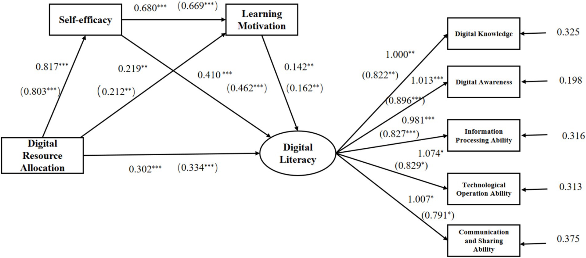 Figure 1. Relationship between digital resource allocation and digital literacy: The mediating role of self-efficacy and learning motivation. *p < 0.05, **p < 0.01, and ***p < 0.001. The coefficients in parentheses are standardized coefficients. The items outside the parentheses are non-standardized coefficients. Source: Authors’ own creation.