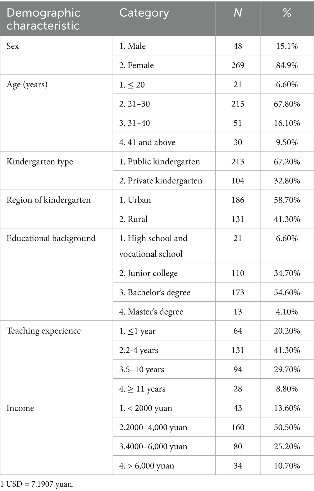 The southeastern region of China has a relatively high level of economic development and has invested significantly in digital education, which reflects a typical environment for “digital literacy” research. Therefore, this study used random sampling to recruit kindergarten teachers from the southeastern region of China to participate in a questionnaire survey. All participants took part voluntarily and were informed that they could withdraw at any stage of the investigation. A total of 318 questionnaires were collected, 317 valid questionnaires were retained and used for subsequent data analysis, resulting in an effective rate of 99.69%. Ethical approval for this study was obtained from the Ethics Committee of the Medical and Life Sciences at Inner Mongolia Minzu University (approval number: NMD-RT-1025-08-01). Table 1 presents the demographic information of the respondents, including teachers’ sex, age, teaching experience, income level, educational background, region, and kindergarten type.