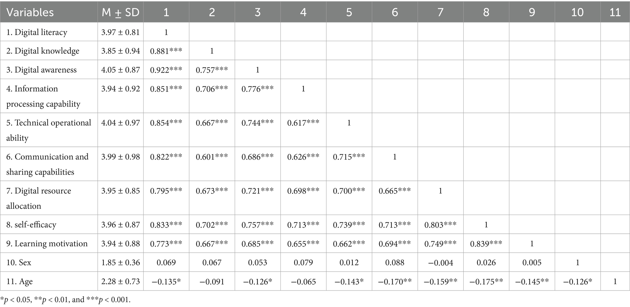 Table 2 presents the correlation coefficients between the independent and dependent variable dimensions. All five subdimensions of digital literacy and digital resource allocation indicate significant positive correlation with each other as well as with self-efficacy, and learning motivation.