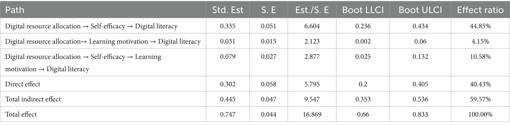 To verify the research hypotheses, this study employed Mplus 8.0 to examine the mediation effects. The model included digital resource allocation, self-efficacy, learning motivation, and kindergarten teachers’ digital literacy as outcome variables, with digital resource allocation as the predictor variable and self-efficacy and learning motivation as mediating variables. The aim was to explore the potential mediating relationships between digital resource allocation and the outcome variables. Figure 1 and Table 3 present the analysis results. Mplus 8.0 was also used to assess the significance of total, direct, and indirect effects, and the Bootstrap method (with 5,000 iterations and a confidence interval of 95%) was employed to test and construct the chain mediation model.