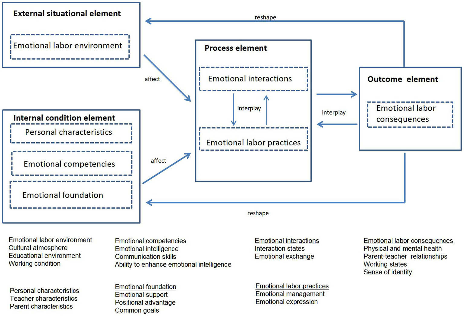 In previous studies, two approaches have been used to investigate the influencing factors of teachers’ emotional labor in parent–teacher interactions. One approach embodies Grandey’s conceptual framework (Grandey, 2000), suggesting that there are three factors: situational cues, organizational factors and personal factors. Situational cues not only include positive or negative emotional events (Goldberg and Grandey, 2007; Liang, 2019) but also include the ways in which teachers interact with parents (Farouk, 2012). Organizational factors such as school policy (Darby et al., 2011), school cultural environment (Cross and Hong, 2012), working conditions (Barutçu and Serinkan, 2013; Hassard et al., 2017) also impact their emotional labor. Personal factors such as teachers’ gender, personality, teaching age, qualifications, professional awareness, emotional intelligence affect teachers’ emotional labor in parent–teacher interactions (Basim et al., 2013; Yin et al., 2017; Gonzales, 2022). These studies reflect the perspectives on emotional labor from the work levels and the individual level (Brotheridge and Grandey, 2002). Another approach is to draw on insights from emotional geography (Hargreaves, 2001; Hargreaves and Lasky, 2004), that is, from the perspectives of sociocultural geography, moral geography, professional geography, political geography, and physical geography, which highlights the influence of factors such as parents’ sociocultural status, teachers’ moral purposes, teachers’ perceptions of boundaries between schools and homes, hierarchical power structures in parent–teacher interactions, and the frequency of parent–teacher contact (Chen and Wang, 2011; Dotger et al., 2011; Zembylas, 2015; Stroetinga et al., 2019).