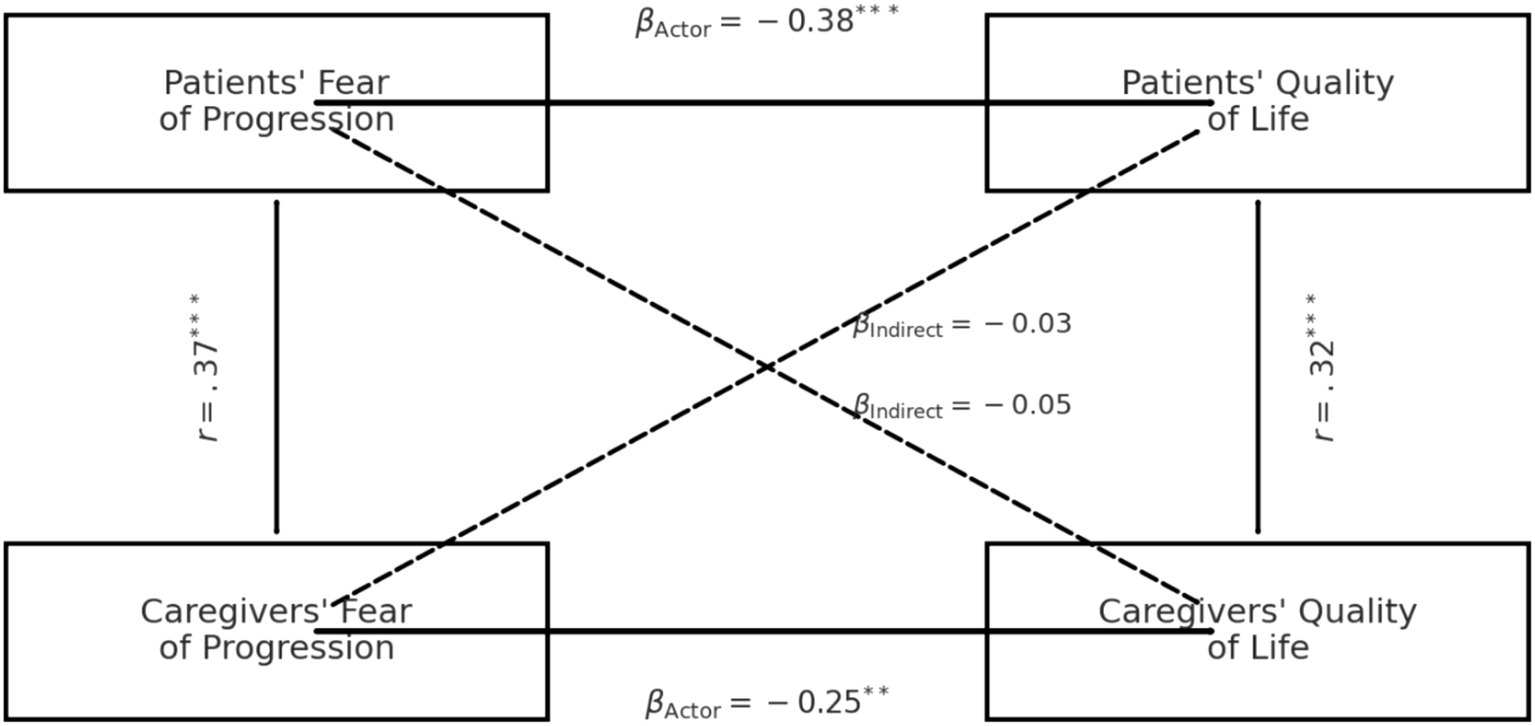 APIM were tested with structural-equation modelling, treating survivors and caregivers as distinguishable roles. In practical terms, the analysis asked four linked questions at once: (1) Does a survivor’s fear of progression (FoP) predict their own quality of life (actor effect)? (2) Does a survivor’s FoP exert a cross-partner influence on the caregiver’s quality of life (partner effect)? (3) Does a caregiver’s FoP affect their own quality of life (actor effect)? and (4) Does a caregiver’s FoP exert a cross-partner influence on the survivor’s quality of life (partner effect)? All paths were adjusted for survivor age, time since diagnosis, and comorbidity count, as well as caregiver age, to minimise confounding (Kline, 2016).