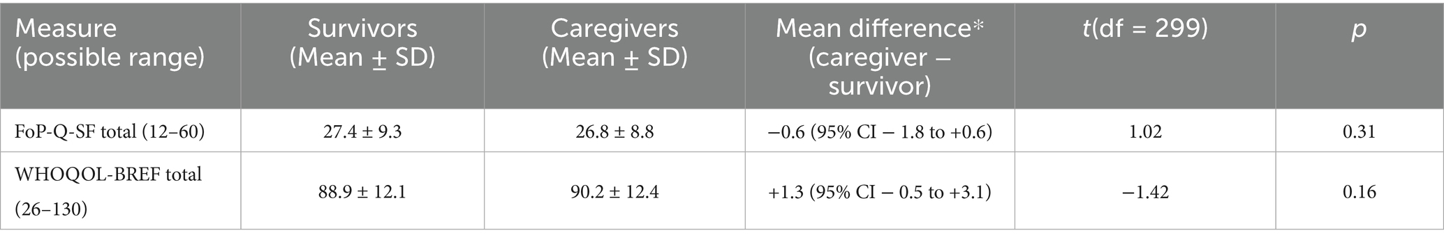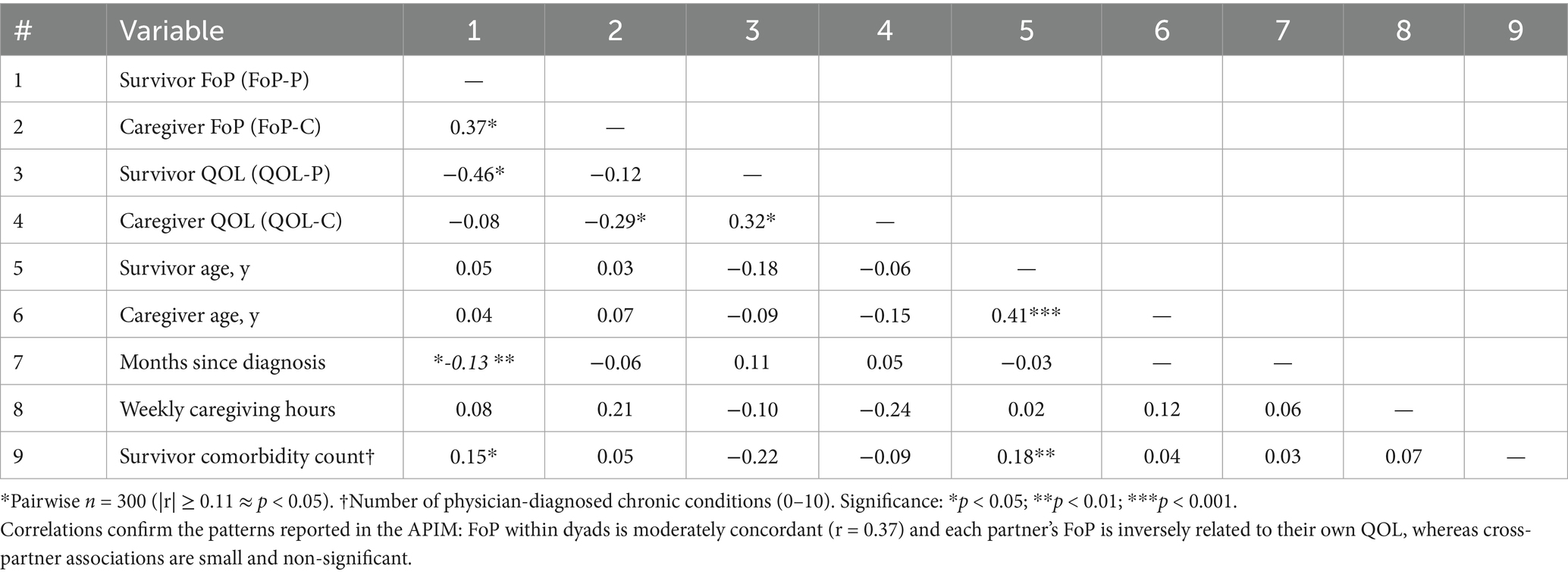 As shown in Table 2, mean FoP-Q-SF scores were 27.4 ± 9.3 for survivors and 26.8 ± 8.8 for caregivers (paired t = 1.02, p = 0.31). Mean WHOQOL-BREF totals were 88.9 ± 12.1 and 90.2 ± 12.4, respectively (paired t = −1.42, p = 0.16). Intraclass correlations indicated moderate within-dyad similarity for FoP (ICC = 0.37, 95% CI 0.27–0.46) and QOL (ICC = 0.32, 95% CI 0.21–0.41). Zero-order Pearson correlations among study variables are provided in Table 3.