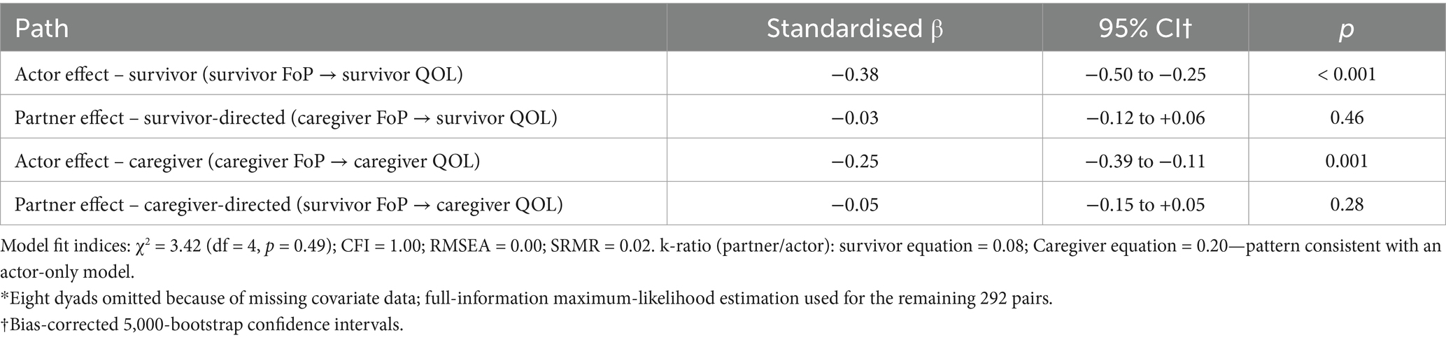 Re-estimating models with complete cases (n = 292) yielded actor and partner coefficients that were within the FIML 95% CIs and did not change substantive conclusions. These findings indicate that our results are robust to reasonable assumptions about the missing-data mechanism (MAR) and to the choice of estimation (FIML vs. complete-case). The hypothesised APIM demonstrated excellent fit to the data (χ2 = 3.42, df = 4, p = 0.49; CFI = 1.00; RMSEA = 0.00; SRMR = 0.02). Standardised path coefficients are displayed in Figure 1 and numerically summarised in Table 4. Actor effects were significant for both dyad members: higher FoP predicted poorer QOL for survivors (β = −0.38, 95% CI –0.50 to −0.25, p < 0.001) and for caregivers (β = −0.25, 95% CI –0.39 to −0.11, p = 0.001). Partner effects were small and non-significant: caregiver FoP did not predict survivor QOL (β = −0.03, 95% CI –0.12 to 0.06, p = 0.46) and survivor FoP did not predict caregiver QOL (β = −0.05, 95% CI –0.15 to 0.05, p = 0.28). The partner-to-actor ratio (k) was 0.08 for the survivor equation and 0.20 for the caregiver equation, confirming an actor-only pattern.