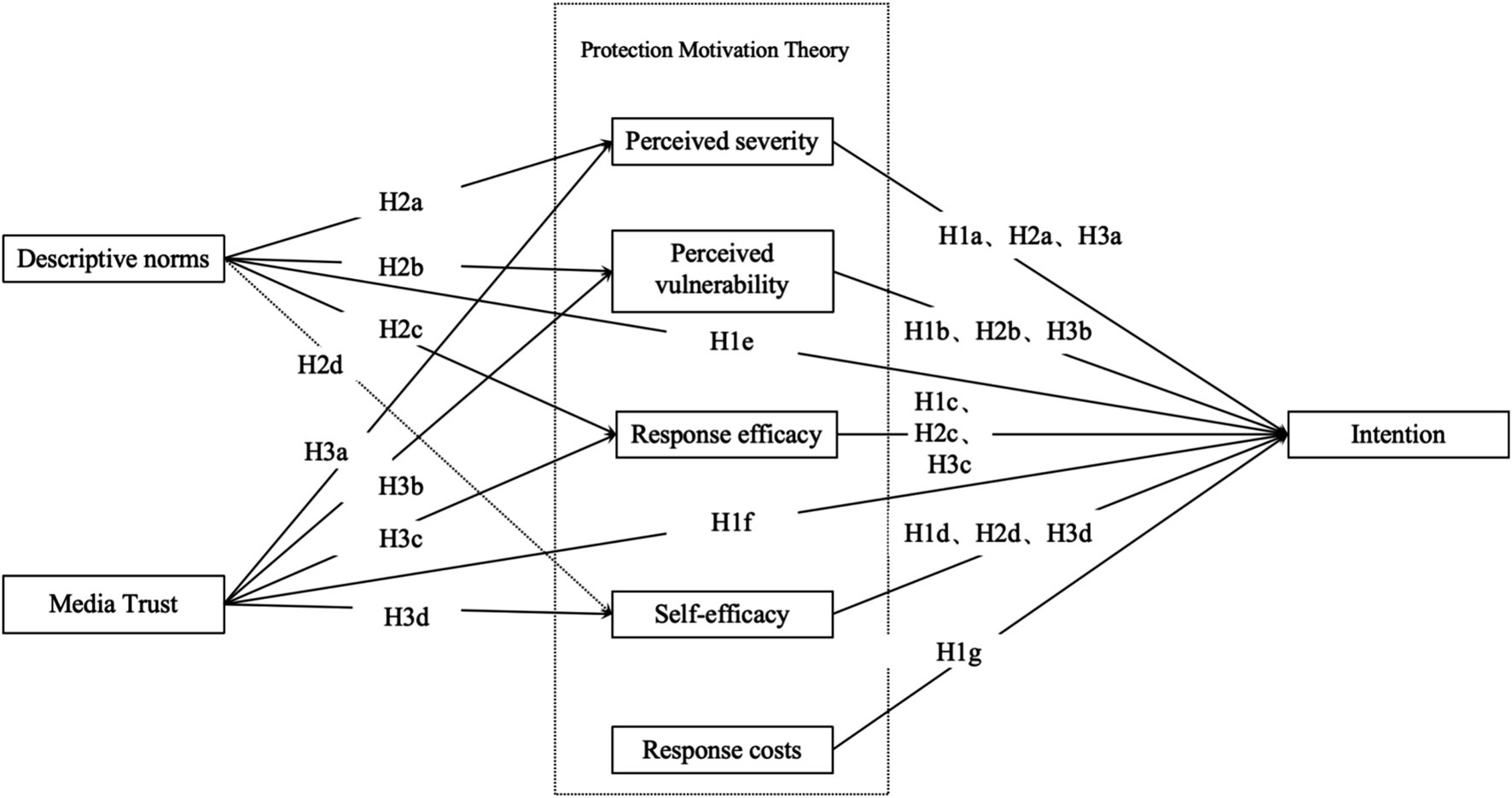 Protection Motivation Theory (PMT) offers a systematic account of how threat appraisal (perceived severity and perceived vulnerability) and coping appraisal (response efficacy and self-efficacy) motivate preventive action. Yet classic critiques argue that PMT, in its canonical form, under-specifies social-contextual forces—notably the role of social norms in shaping intentions and behavior (Fishbein, 2007). Building on this insight, we extend PMT by incorporating two contextual determinants that are theoretically poised to inform PMT cognitions and downstream intentions: descriptive norms and media trust.