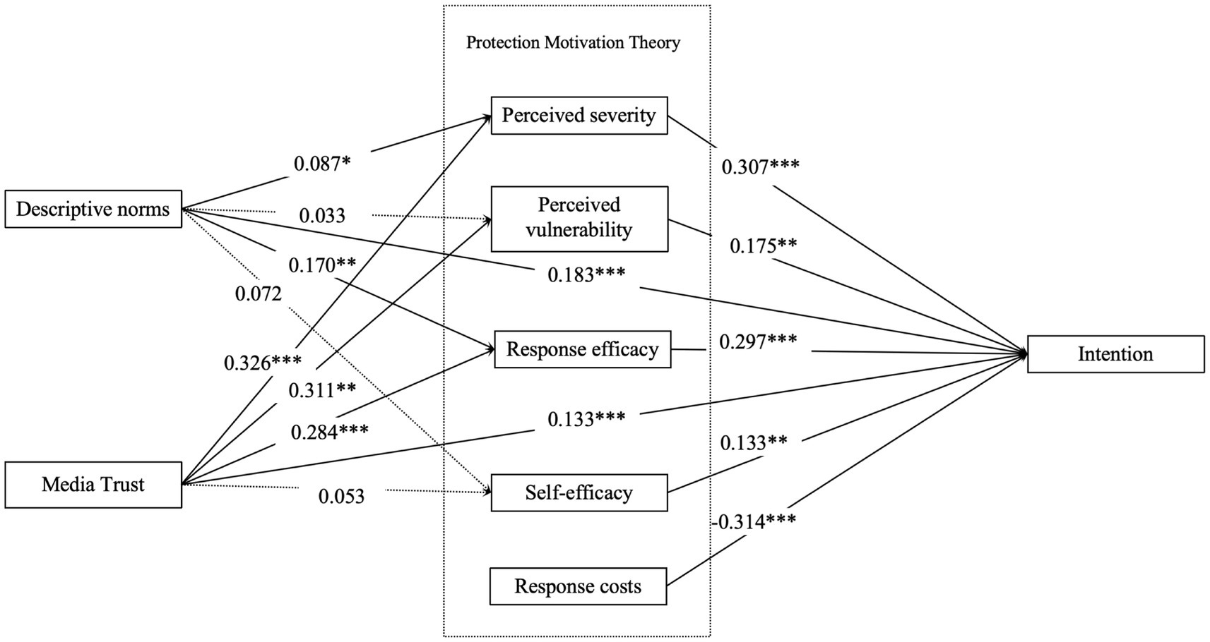 Media function as central infrastructures for risk information acquisition and social interaction; accordingly, individuals’ exposure to and trust in these sources shape information processing and health behavior (Li and Bautista, 2020; Lin and Lagoe, 2013). Because lay audiences often cannot directly verify complex scientific claims, trust in knowledge authorities becomes a necessary cognitive shortcut for attitude formation (Blöbaum, 2016). Consequently, information sources with higher credibility often have more pronounced effects on attitude changes (Petty and Cacioppo, 1984), and people filter information according to their trust in media, with varying degrees of trust in different information channels determining different behavioral intentions (Zhao et al., 2020). In vaccination contexts, higher media trust is consistently associated with stronger vaccination willingness (Chen et al., 2023; Glauberman et al., 2024; Limbu and Gautam, 2023; Pérez et al., 2016). Beyond direct effects, media trust has cognitive and affective impacts (Ball-Rokeach and DeFleur, 1976). And may operate through PMT variables—e.g., amplifying perceived severity and vulnerability and reinforcing response efficacy—to shape motivation (Li and Sun, 2021). Within our extension, media trust therefore serves as a contextual driver that both directly promotes willingness and indirectly strengthens PMT cognitions.