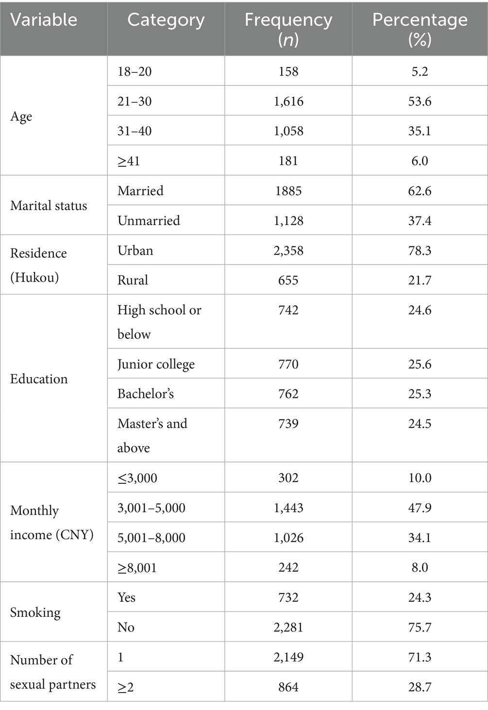The China Comprehensive Cervical Cancer Prevention and Control Guidelines indicates that the appropriate age range for HPV vaccination is 9–45 years. We targeted men aged 18–45 because (i) the recommended vaccination window extends up to 45 years, (ii) 18 marks legal adulthood for independent consent, and (iii) this range captures sexually active men with higher exposure risk, for whom vaccination may yield both direct protection and indirect benefits via transmission interruption. Using SPSS 26.0, we analyzed the sociodemographic characteristics of the 3,013 male participants (Table 1).