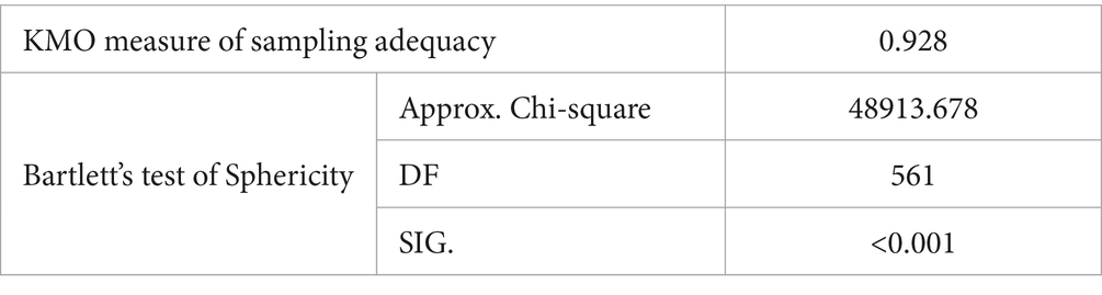 To assess the underlying factor structure of all measurement items, a principal component analysis (PCA) was conducted on the 34 items comprising the eight latent constructs. Prior to extraction, sampling adequacy was verified. The Kaiser–Meyer–Olkin (KMO) measure of sampling adequacy was 0.928, and Bartlett’s test of sphericity yielded a χ2 value of 48,913.678 (df = 561, p < 0.001). These statistics indicate that the data are well-suited for PCA analysis (Table 2).