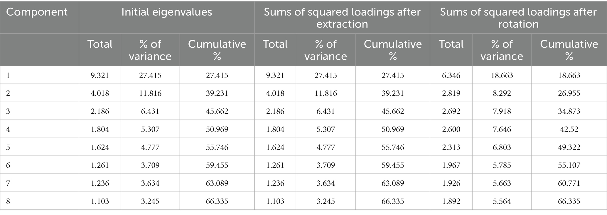 PCA extracted eight principal components that together explained 66.335% of the total variance—exceeding the 60% benchmark commonly applied in behavioral science. In the unrotated solution, the first component accounted for 27.415% of the variance, which is below the 40% threshold suggested for detecting common-method bias; hence, common-method bias is unlikely to compromise further analyses (Table 3).