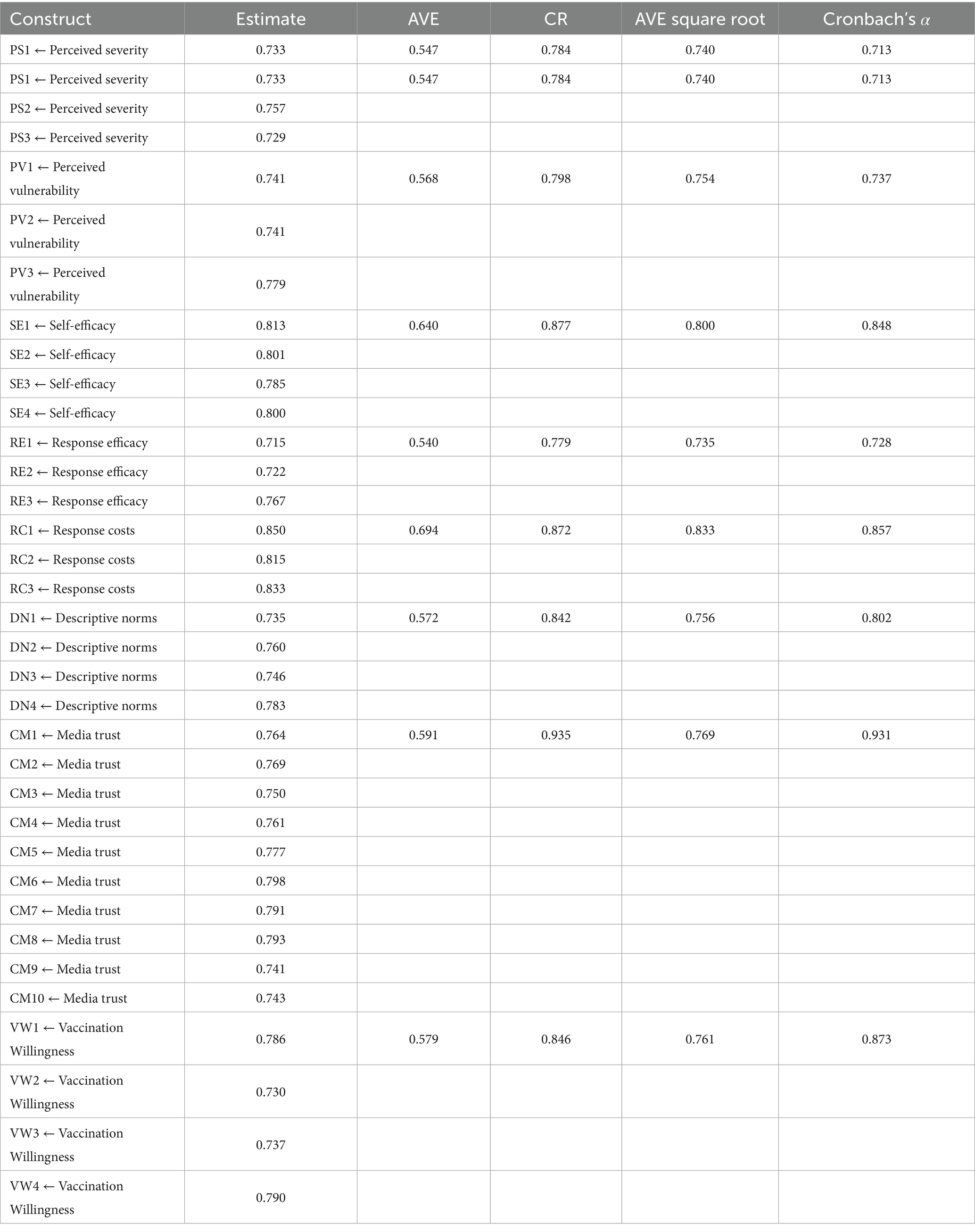 Cronbach’s α coefficients for the eight latent constructs span 0.713 (Perceived Severity) to 0.931 (Media Trust), exceeding the conventional 0.70 threshold and confirming strong internal consistency across all scales. Confirmatory factor analysis shows that standardised factor loadings range from 0.715 to 0.850, well above the 0.50 criterion; average variance extracted (AVE) values fall between 0.540 and 0.694; and composite reliability (CR) indices range from 0.779 to 0.935. Together, these indicators demonstrate satisfactory convergent validity and reliability.