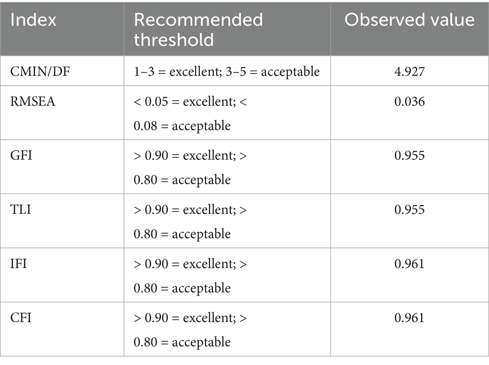 The proposed structural equation model was evaluated in AMOS 29.0. After model refinement, the fit statistics met recommended thresholds (Table 5). CMIN/DF was 4.927 (between 3 and 5 indicates adequate fit), RMSEA was 0.036 (< 0.05 denotes excellent fit), and incremental indices (GFI = 0.955, TLI = 0.955, IFI = 0.961, CFI = 0.961) all exceeded the 0.90 criterion. Collectively, these indices provide strong evidence that the structural model reproduces the observed covariance matrix with satisfactory fidelity.