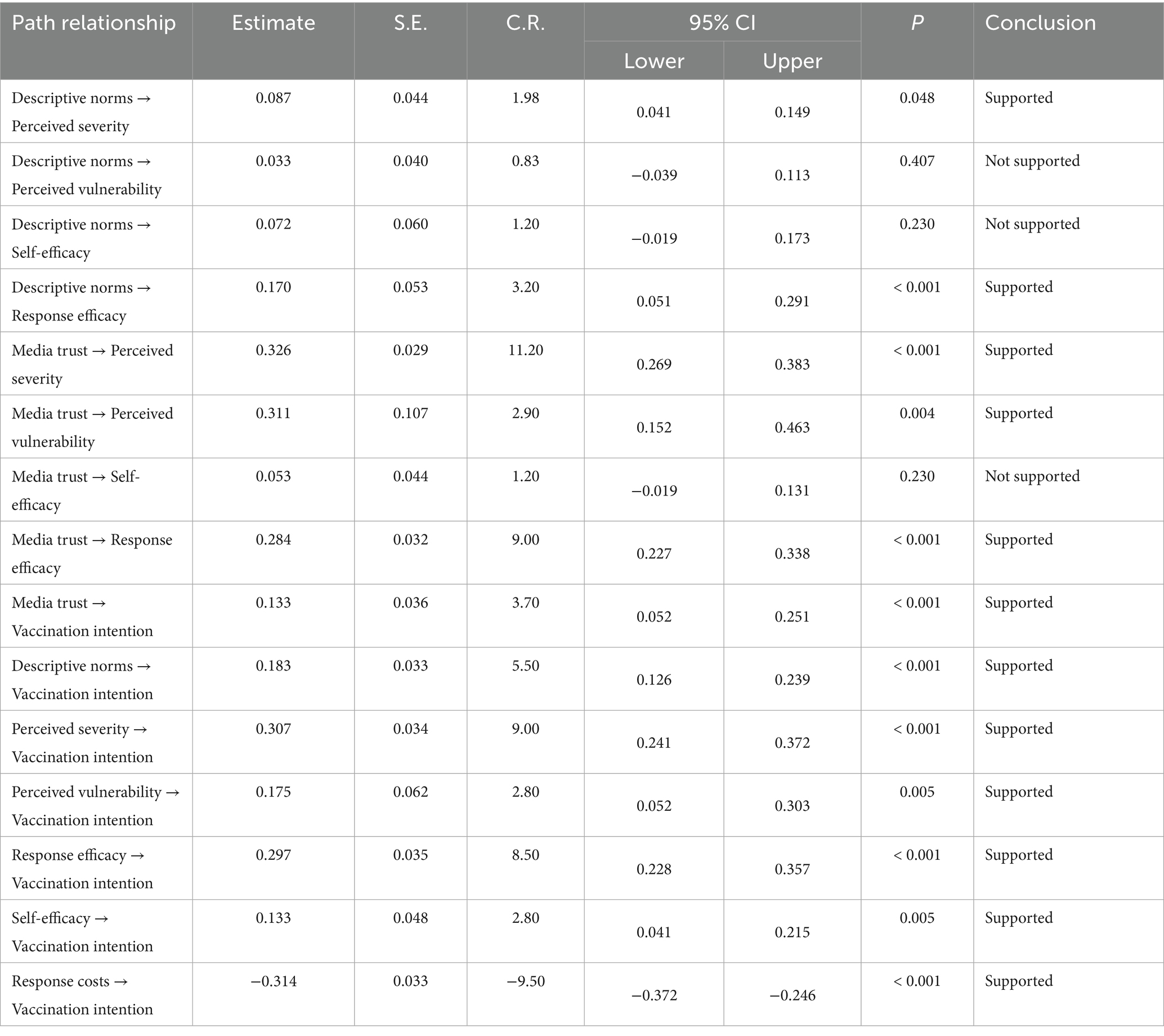 Results: Vaccination willingness was positively associated with perceived severity (β = 0.307, 95% CI [0.241, 0.372]), perceived vulnerability (β = 0.175, 95% CI [0.052, 0.303]), response efficacy (β = 0.297, 95% CI [0.228, 0.357]), self-efficacy (β = 0.133, 95% CI [0.041, 0.215]), descriptive norms (β = 0.183, 95% CI [0.126, 0.239]), and media trust (β = 0.133, 95% CI [0.052, 0.251]) (all p < 0.01). Perceived response cost was negatively associated with willingness (β = −0.314, 95% CI [−0.372, −0.246], p < 0.001). Descriptive norms indirectly promoted willingness via perceived severity and response efficacy; media trust exerted three indirect paths through perceived severity, perceived vulnerability, and response efficacy.