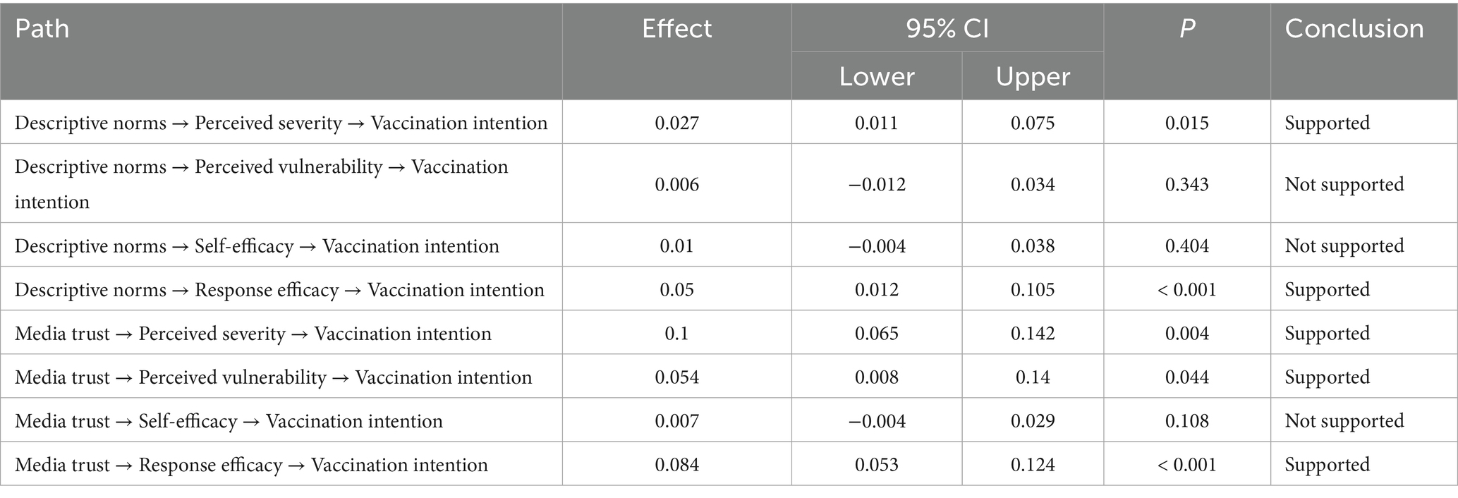 For media trust, several mediational paths to vaccination intention were significant. Greater trust in media was indirectly associated with stronger vaccination intention via perceived severity (indirect effect = 0.100, 95% CI [0.065, 0.142], p < 0.05) and via perceived vulnerability (indirect effect = 0.054, 95% CI [0.008, 0.140], p < 0.05), implying that trusted information sources heighten both perceived seriousness of HPV and perceived personal susceptibility, which in turn promote intention to vaccinate. Media trust was also indirectly related to vaccination intention through response efficacy (indirect effect = 0.084, 95% CI [0.053, 0.124], p < 0.001), consistent with the interpretation that credible information strengthens confidence in the effectiveness of HPV vaccination. By contrast, the pathway via self-efficacy alone was not statistically reliable (indirect effect = 0.007, 95% CI [−0.004, 0.029], p = 0.108). Overall, these results suggest that media trust shapes men’s HPV vaccination intention chiefly by increasing perceived threat relevance (severity and vulnerability) and confidence in the vaccine’s effectiveness, rather than by enhancing perceived behavioral capability. In line with this pattern, H3a, H3b, and H3d were supported, whereas H3c was not.