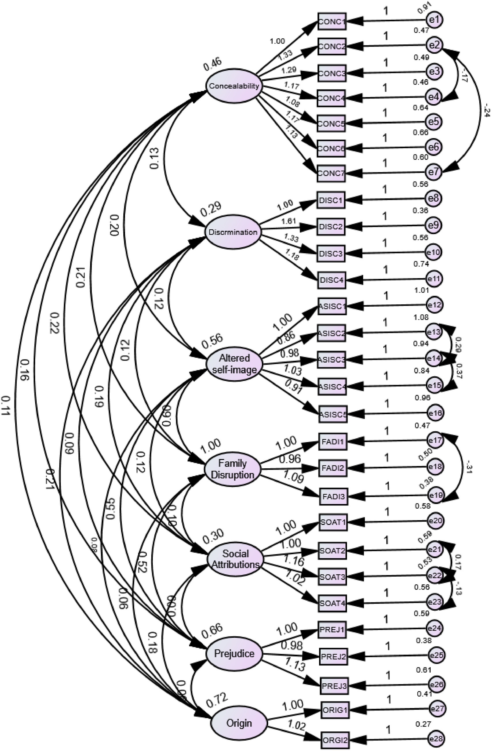 Figure 1. Confirmatory factor analysis (CFA) model of the seven-factor Chinese version of the Breast Cancer Stigma Assessment Scale (C-BCSAS) after modification. The figure presents the structural equation model of the seven-factor, 28-item structure after theory-consistent modifications based on modification indices. Ovals represent the seven latent factors: (1) Concealability, (2) Discrimination, (3) Altered Self-Image/Self-Concept, (4) Family Disruption, (5) Social Attribution, (6) Prejudice, and (7) Origin. Rectangles represent observed items (28 total). Single-headed arrows from factors to items show standardized factor loadings (all λ > 0.50, all p < 0.001). Small circles represent measurement errors (e1–e28). Curved double-headed arrows between error terms (e2-e7, e2-e4, e13-e14, e17-e19, e21-e22, e22-e23) represent correlated errors added based on modification indices (MI > 10) to account for shared method variance or similar item wording. Model fit: χ2/df = 4.446, CFI = 0.829, TLI = 0.800, GFI = 0.848, AGFI = 0.809, RMSEA = 0.083 (90% CI = 0.079–0.088). Despite marginal fit, this structure was retained to preserve theoretical integrity and enable cross-cultural comparison.