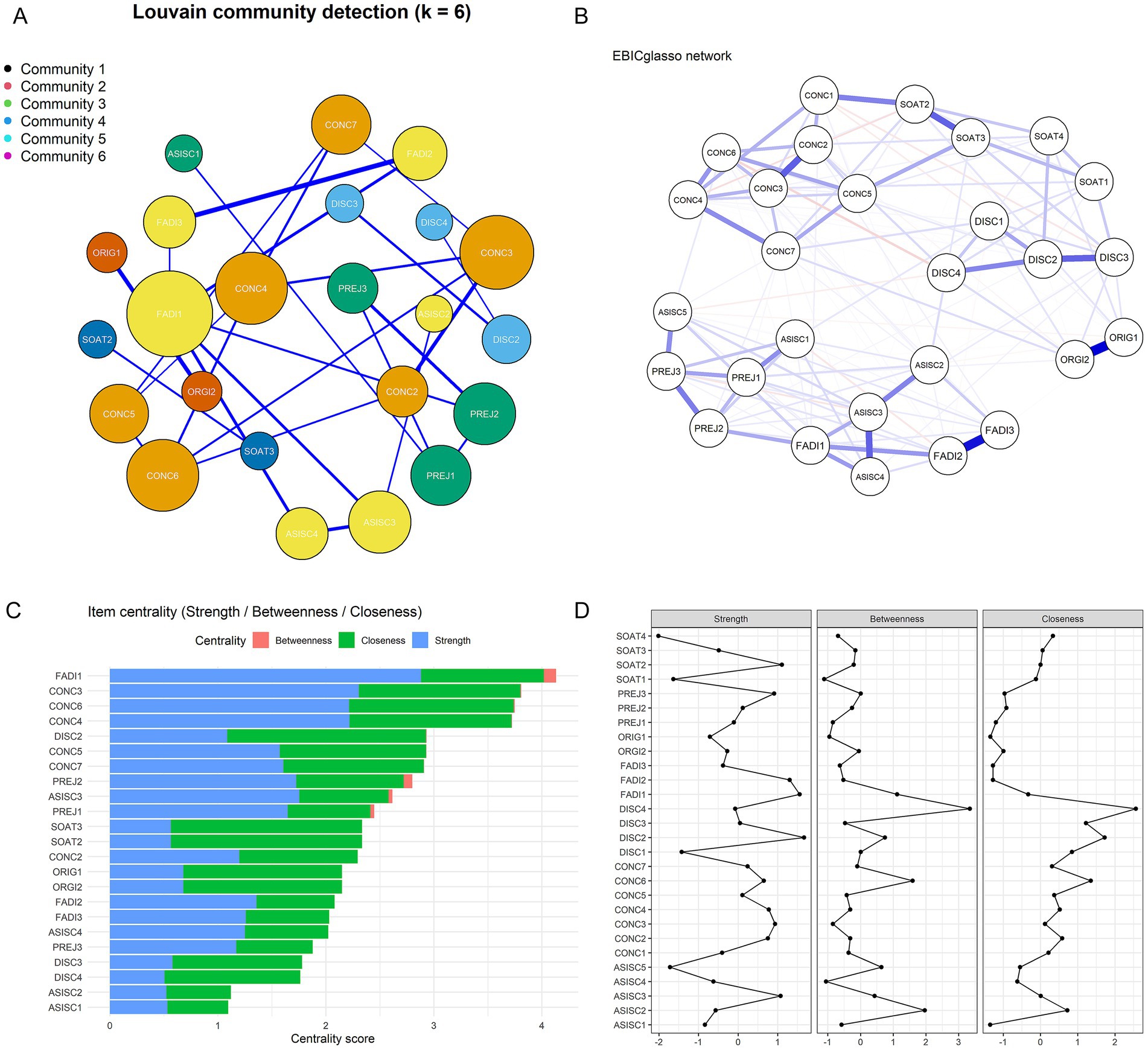A partial correlation network was constructed using a Gaussian Graphical Model (GGM) with regularization (Epskamp et al., 2018). Centrality indices (Strength, Betweenness, Closeness) identified potentially influential items, and the Louvain algorithm explored natural item clustering patterns (Han et al., 2024). Bootstrap procedures (n = 1,000) assessed network stability, with correlation stability coefficients (CS-coefficient) > 0.25 indicating acceptable stability (Feng et al., 2025). This exploratory approach complemented CFA findings to inform clinical understanding, while the seven-factor structure validated through CFA remained the primary psychometric model.