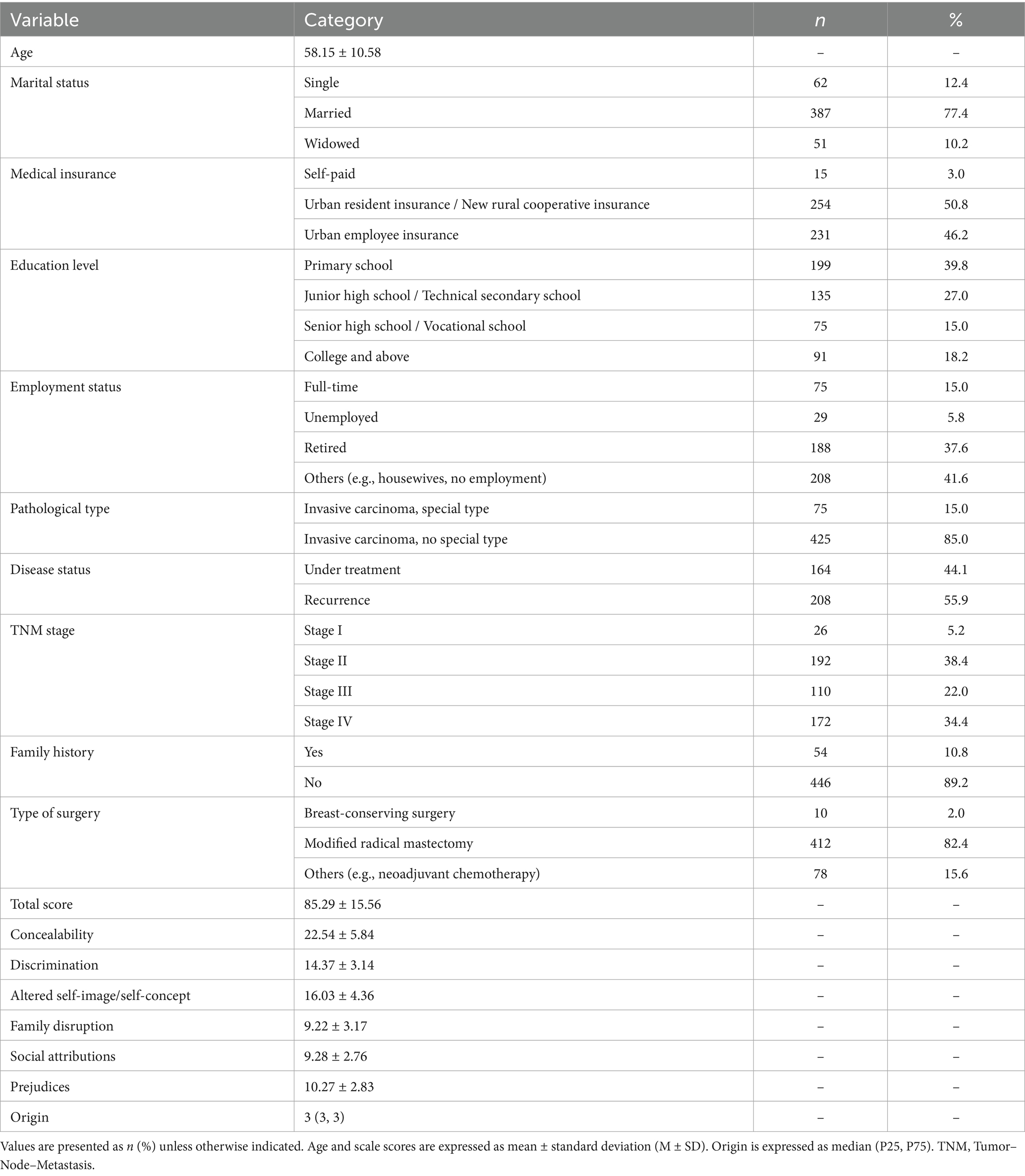 Breast cancer is a malignant tumor originating from breast tissue and is one of the most common cancers among women worldwide, accounting for approximately 25% of all female cancers (Lei et al., 2021). According to the latest report from the National Cancer Center of China, breast cancer ranks second among malignancies in Chinese women, with 357,200 newly diagnosed cases in 2022 (Sun et al., 2024). The incidence continues to rise annually, and the age of onset is trending younger. With the widespread implementation of early screening and advances in comprehensive treatment strategies, survival rates of breast cancer patients have improved substantially (Tang et al., 2025); however, the psychosocial challenges associated with the disease and its treatment have become increasingly prominent (Yang et al., 2025). Among these psychosocial challenges, stigma has emerged as a particularly salient issue, as patients must not only cope with physical sequelae of treatment but also navigate negative societal perceptions attached to the illness (Zamanian et al., 2022).