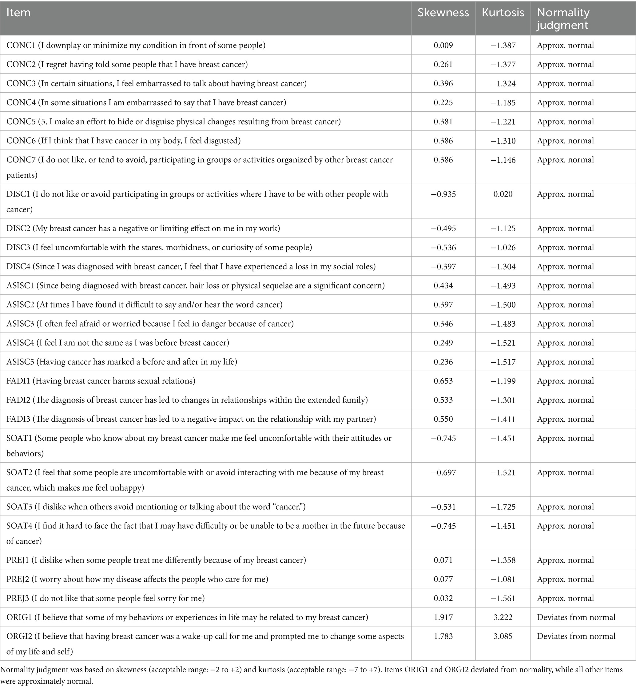 Table 2. Skewness, kurtosis, and normality assessment of the chinese version of the breast cancer stigma scale (BCSAS) items.
