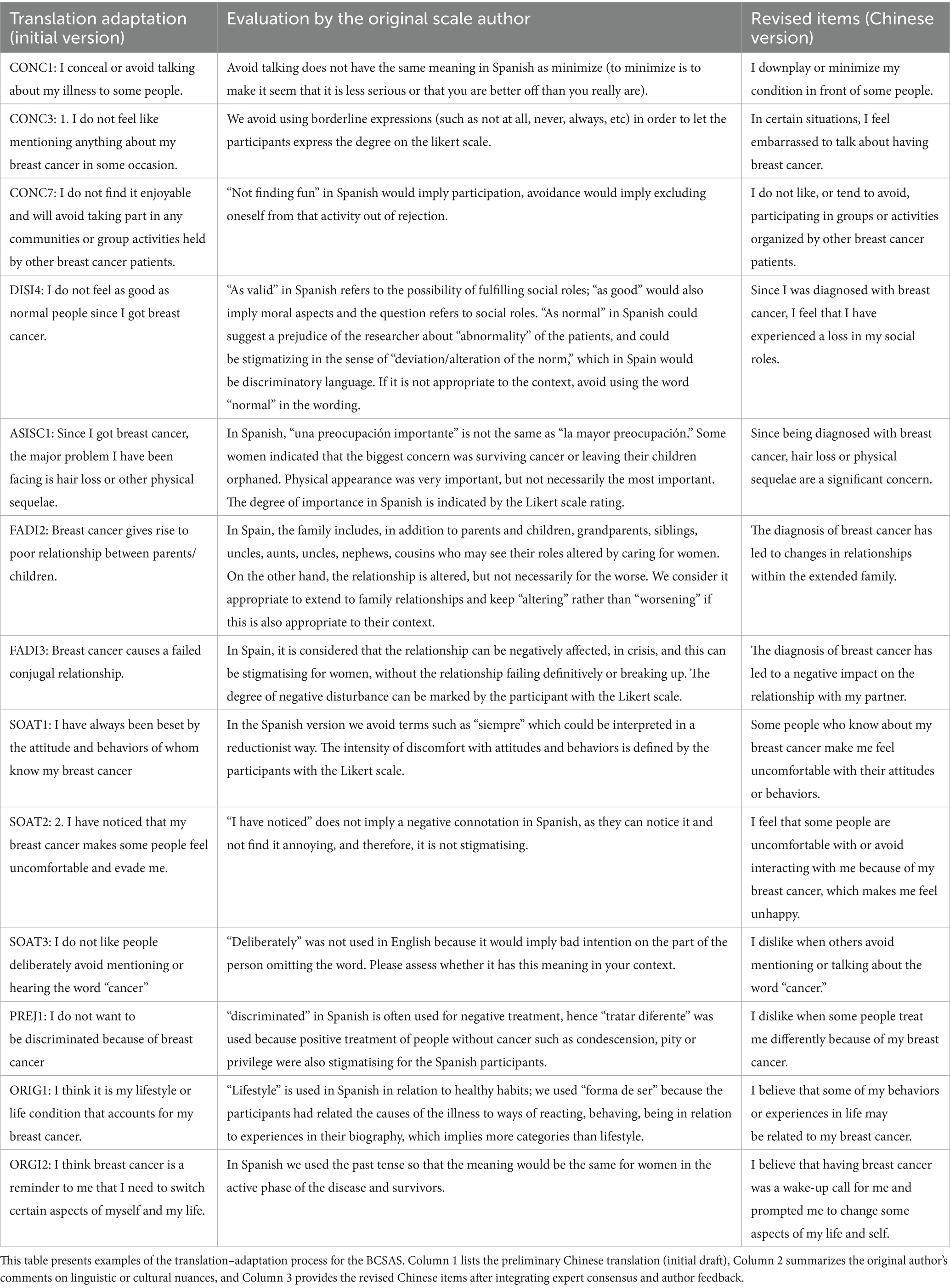 Author feedback: The original author reviewed the back-translated Chinese version of the BCSAS and provided comments and revisions to ensure conceptual and semantic equivalence across languages. The detailed modifications are presented in Table 3.