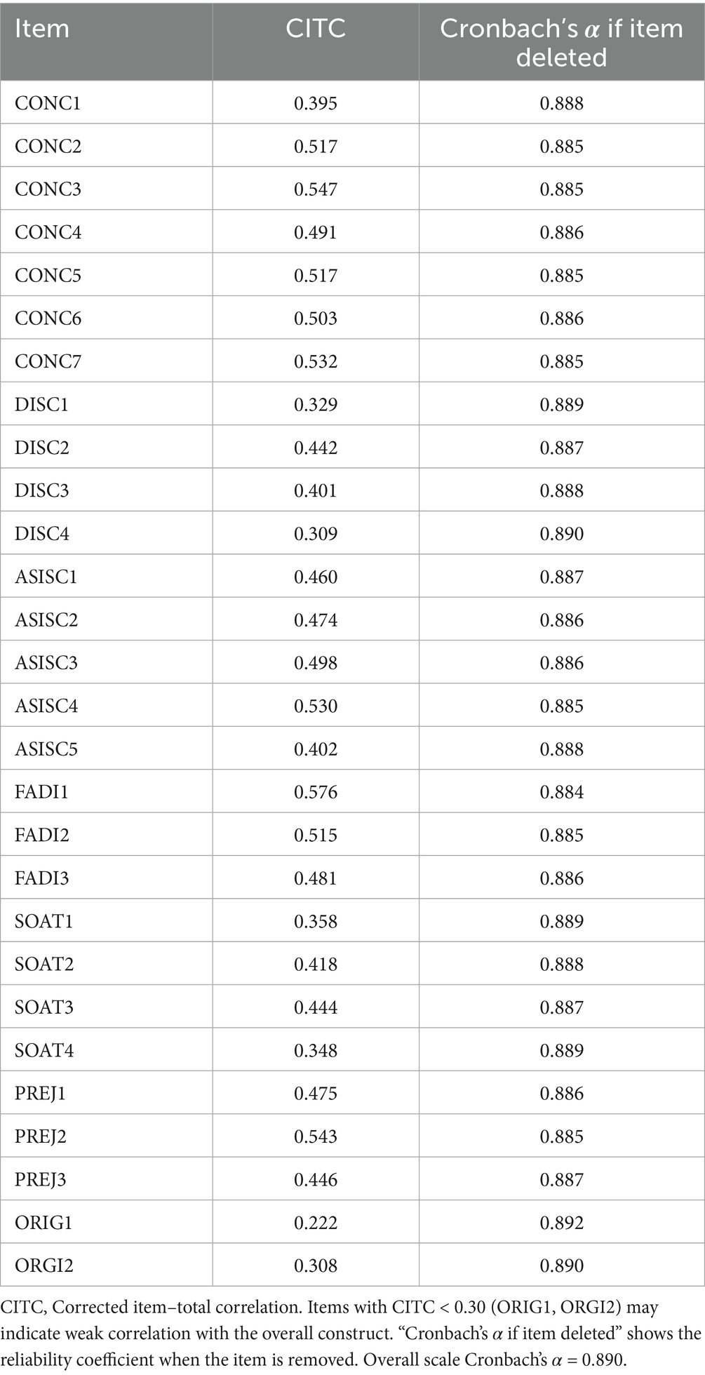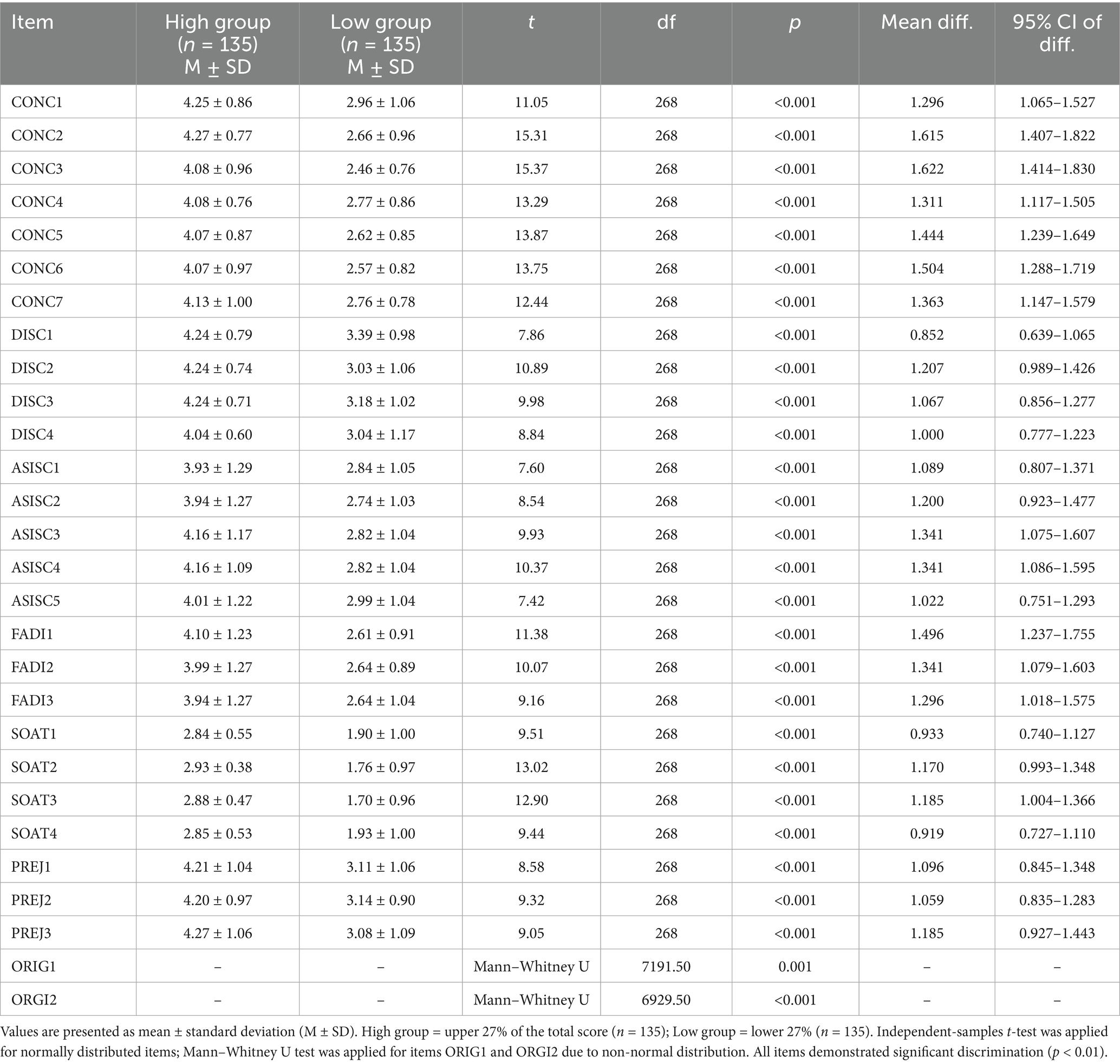 Item analysis was conducted using high–low group comparison and correlation analysis (Boateng et al., 2018). Based on the total score, the sample was divided into a high-score group and a low-score group using the 27th percentile method, and item-score differences between the two groups were compared (Cappelleri et al., 2014). The 27th percentile was chosen as the cutoff because it is commonly used in psychometrics to maximize discrimination while ensuring sufficient sample size (Kelley, 1939; Rush et al., 2016). Independent-samples t-tests were used for normally distributed items, while Mann–Whitney U tests were applied when normality (tested via Kolmogorov–Smirnov) was violated (Chicco et al., 2025). Items with significant t-values or Z-values (p < 0.05) in extreme group comparisons were considered to have adequate discriminatory capacity (Cappelleri et al., 2014). Corrected item-total correlations (CITCs) were calculated to assess the relationship between individual items and the overall scale, as well as item-dimension correlations. Items with CITC values ≥0.30 were retained as acceptable, while those with values <0.20 were considered for deletion due to poor discriminatory capacity (Heley et al., 2024; Marlow and Wardle, 2014).