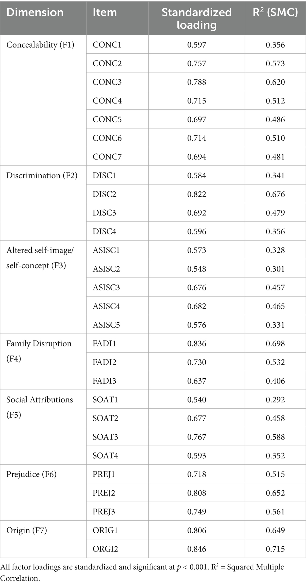 A central challenge in this study was navigating the tension between achieving optimal statistical fit and preserving the theoretical and cross-cultural integrity of the BCSAS. Cross-cultural validation research inherently involves balancing two objectives: (1) cultural appropriateness (emic validity)—ensuring the instrument resonates with local cultural meanings; and (2) cross-cultural comparability (etic validity)—maintaining structural equivalence to enable valid international comparisons (van de Vijver and Leung, 2021). The observed fit indices (χ2/df = 4.446, CFI = 0.829, TLI = 0.800, RMSEA = 0.083) can be interpreted as either model misspecification requiring structural revision, or as genuine cultural variation in stigma phenomenology that should be described rather than “corrected.” We adopted the latter interpretation for several reasons.