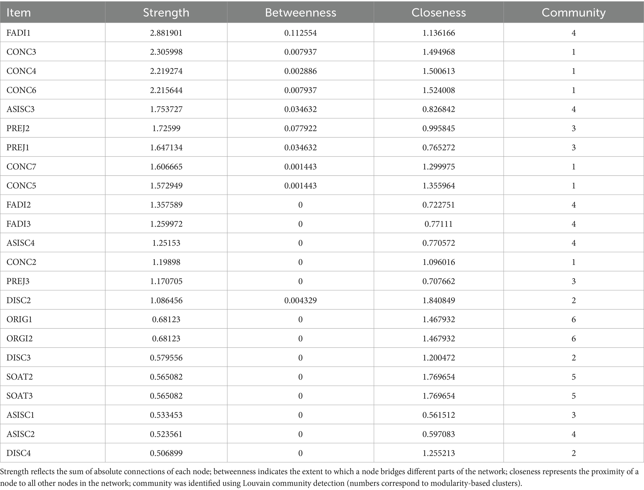 To complement the CFA findings and provide additional insights into stigma phenomenology, exploratory network analysis was conducted. Three centrality indices—Strength, Betweenness, and Closeness—were calculated to evaluate the network characteristics of the 28 items (see Table 7). Results indicated that FADI1 (“Having breast cancer harms sexual relations”) was the most prominent item, with the highest Strength centrality (2.88), suggesting it had the strongest connections with other stigma experiences and served as the core node of the network (Figure 2C). Items CONC3 (“I feel embarrassed to talk about having breast cancer”), CONC4 (“I am embarrassed to say that I have breast cancer”), and CONC6 (“If I think that I have cancer in my body, I feel disgusted”) also demonstrated relatively high Strength values (2.22–2.31), highlighting the central role of concealment and disclosure-related concerns in the stigma experience of Chinese breast cancer patients.