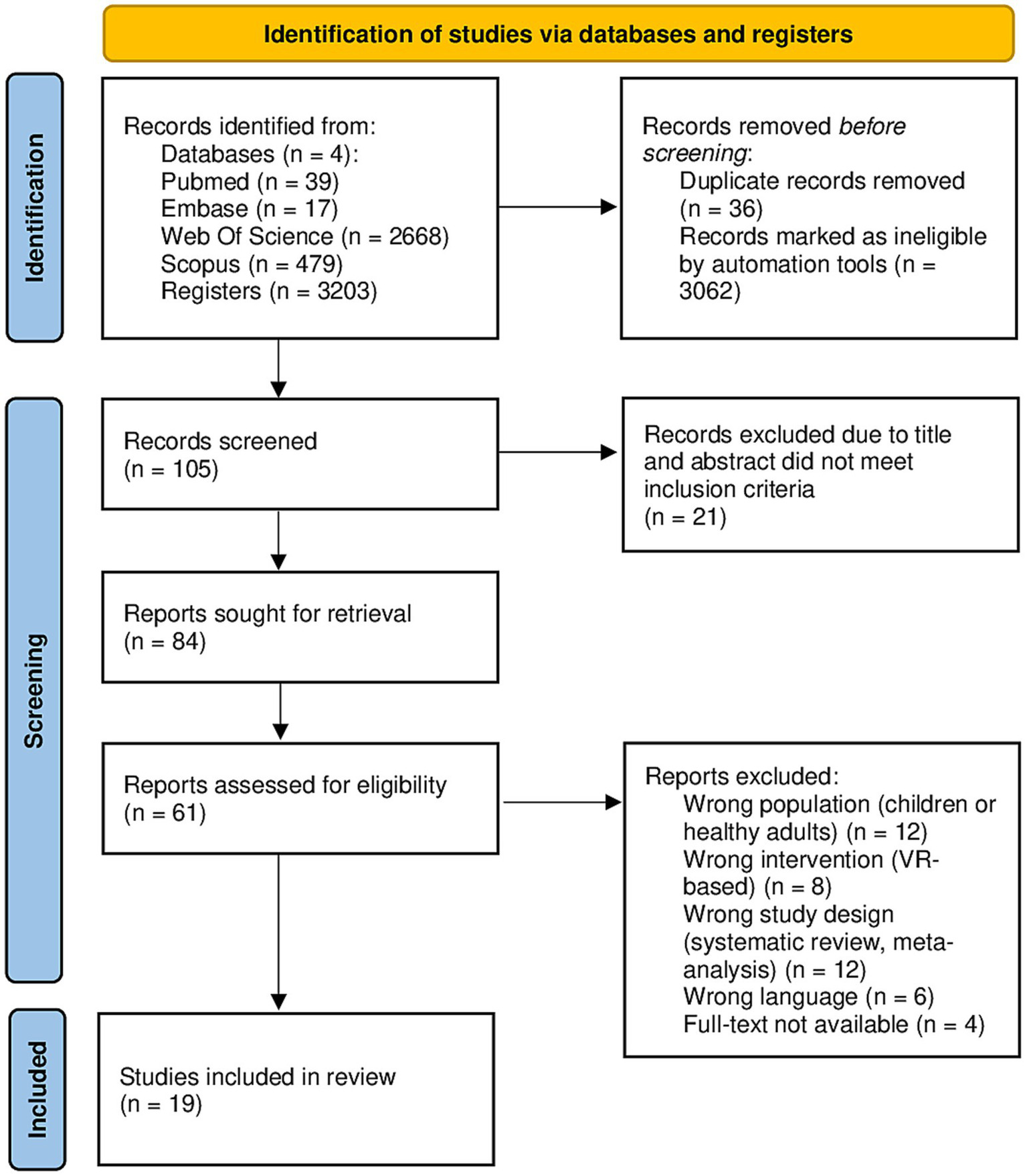 The study selection process followed a systematic approach using predefined eligibility criteria before importing references into Rayyan for screening and deduplication. Initially, 3,203 articles were identified through database searches (PubMed, Scopus, Embase and Web of Science). After applying the eligibility criteria, which included language restrictions (English), publication timeframe (2019–2024), target population (SCD, and MCI), and intervention type (VR-based cognitive training), a total of 141 was deemed relevant for further screening. Using Rayyan, references were managed, screened, and deduplicated. Out of the 141, 84 studies were imported for screening, and 36 duplicates were identified and removed. Following the title and abstract screening, 23 studies were selected for full-text analysis. However, four articles were excluded due to the unavailability of full-text access, which resulted in missing critical information necessary for inclusion. This systematic review ultimately included 19 studies, consisting of 14 RCTs, 2 usability studies, and 3 experimental studies (Figure 1, Table 1, Supplementary Table 1) (Haddaway et al., 2022).