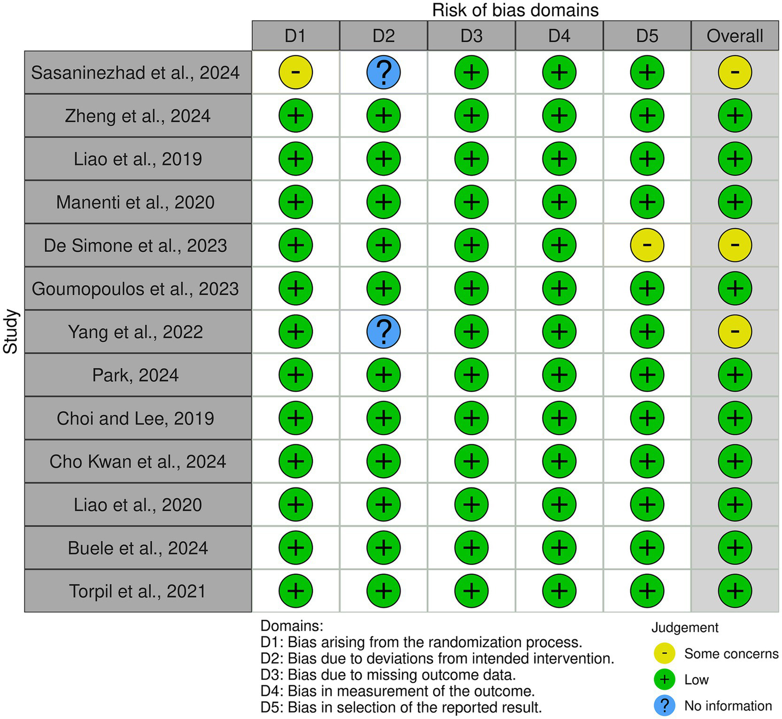 The assessment revealed that most studies demonstrated a low risk of bias across all domains, supporting the reliability of their findings. However, some studies showed some concerns in specific areas. In particular, Sasaninezhad et al. (2024) exhibited some concerns regarding the randomization process, raising questions about allocation concealment or baseline imbalances. Additionally, the study did not provide clear information on deviations from the intended interventions, making it difficult to assess whether variations in protocol implementation may have influenced the results. De Simone et al. (2023) showed some concerns in the selection of reported results, suggesting a potential risk of selective reporting, which could impact the interpretation of the study’s findings. Yang et al. (2022) also had unclear information regarding deviations from intended interventions, limiting the ability to determine whether protocol adherence was consistent across participants.