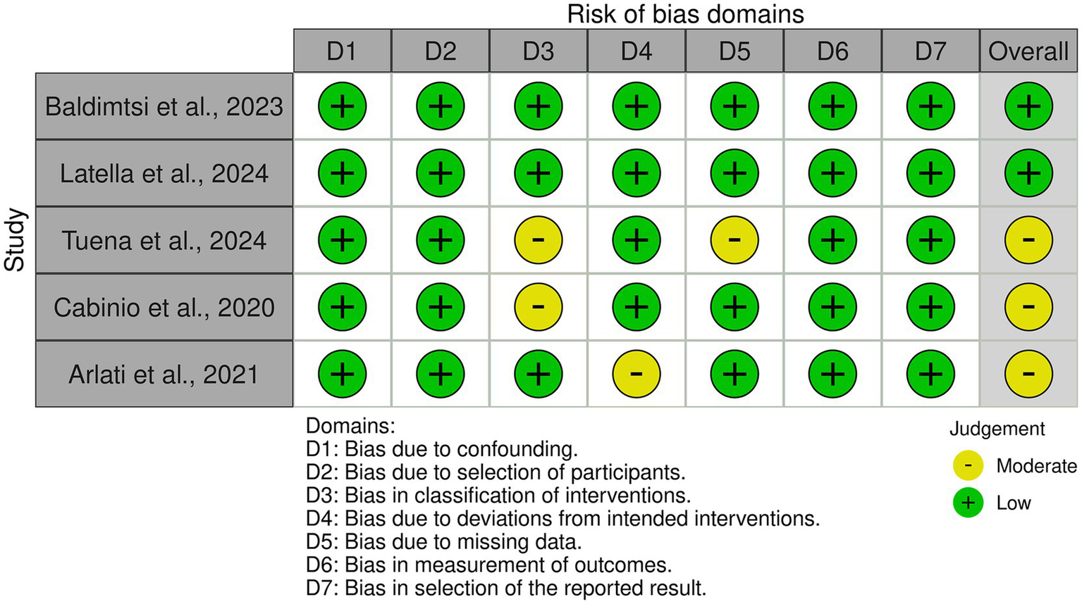 Despite these minor concerns, the overall risk of bias was predominantly low, reinforcing the credibility of the included non-randomized studies. However, the presence of moderate bias in some domains suggests that results should be interpreted with caution, particularly concerning intervention classification and data completeness.
