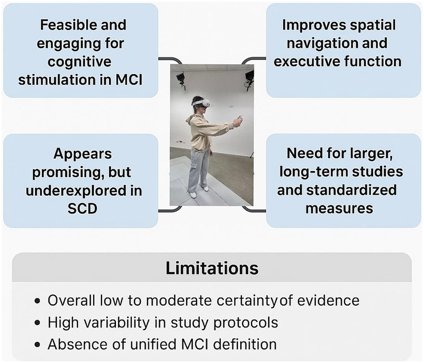 Figure 4. Summary of key findings and limitations of VR-based cognitive interventions in MCI and SCD.