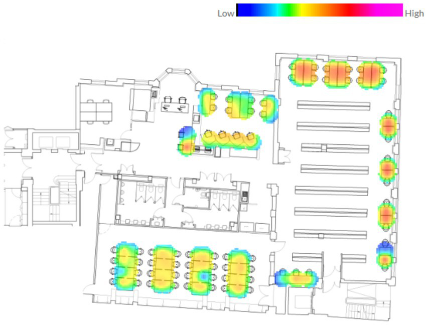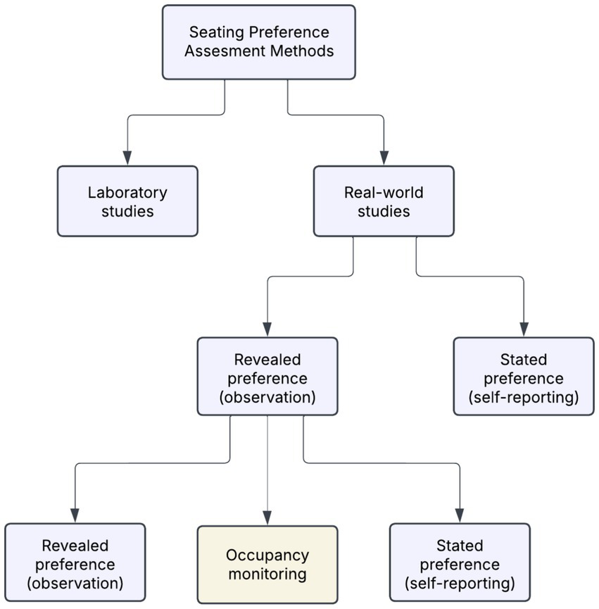 Among revealed preference techniques, three commonly employed sub-methods are snapshot recordings, walk-through observations, and occupancy monitoring. Snapshot recordings capture periodic headcounts, such as every 30 min, to quantitatively track occupancy across different spatial zones. Walk-through observations provide richer qualitative data, such as noting movement paths and behavioral indicators like posture, activity type, or social grouping. However, due to their subjective nature and limited scale, such observations typically require multiple rounds to achieve generalizability. Finally, occupancy monitoring systems, often enabled by passive infrared (PIR) or motion sensors, facilitate large-scale, continuous, and non-intrusive tracking of seat usage. These systems offer high-resolution insights into spatial behavior at scale while preserving the ecological validity of the observed environment.