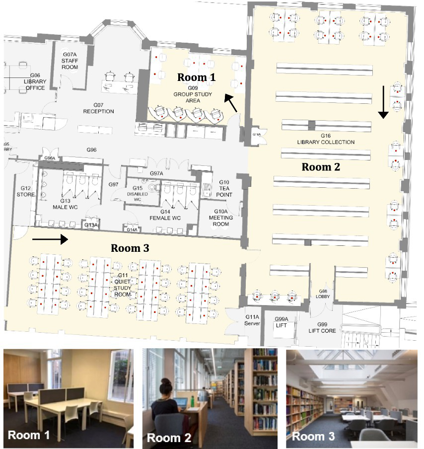 This empirical study was conducted at the UCL Bartlett Library, located on the ground floor of the Central House in London, UK. The library comprises three distinct study rooms, each characterized by unique spatial and environmental features that make the site particularly well-suited for analyzing seat selection behavior. Room 1 includes two north-facing windows and features a combination of eight shared desks and four individual study cubicles. Room 2 is comparatively more open and better illuminated, with multiple windows facing north and east. It contains twelve shared desks and eleven individual desks. Room 3 is a large open-plan area lit primarily by two overhead skylights, accommodating 32 shared desks arranged in a single, flexible layout (Figure 2).