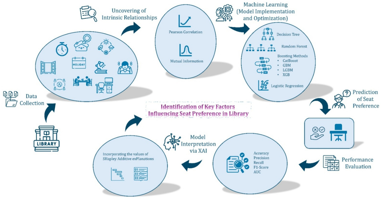 The previous studies highlighted that while numerous environmental, spatial, and individual factors are acknowledged to influence students’ seating choices in academic libraries, their precise interplay and relative importance, particularly when assessed through objective, long-term behavioral data, remain less clearly defined. Existing research often relies on short-term observations or subjective self-reports, and there is a noted underutilization of sensor-based data and advanced computational methods to uncover nuanced, context-rich insights into actual seat usage over extended periods. Furthermore, while machine learning offers potential for modeling such complex behaviors, the translation of these models into actionable, design-oriented guidance through explainable AI (XAI) techniques, particularly methods like SHAP analysis, is an emerging area in this domain.