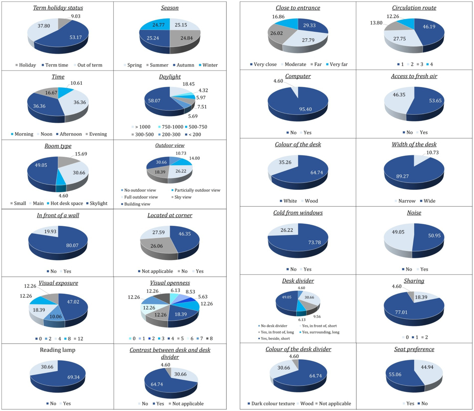 This study addresses these gaps by employing a novel, computational approach to investigate seating preferences in a real-world academic setting. Using passive infrared (PIR) motion sensors installed beneath each desk in the UCL Bartlett Library, a year-long dataset of occupancy records was collected and linked with detailed environmental and spatial variables, such as daylight exposure, access to fresh air, noise level, proximity to circulation routes, and desk configuration. Unlike earlier research relying on short-term observation windows or self-reported preferences, this study offers a comprehensive, objective dataset at the seat level.