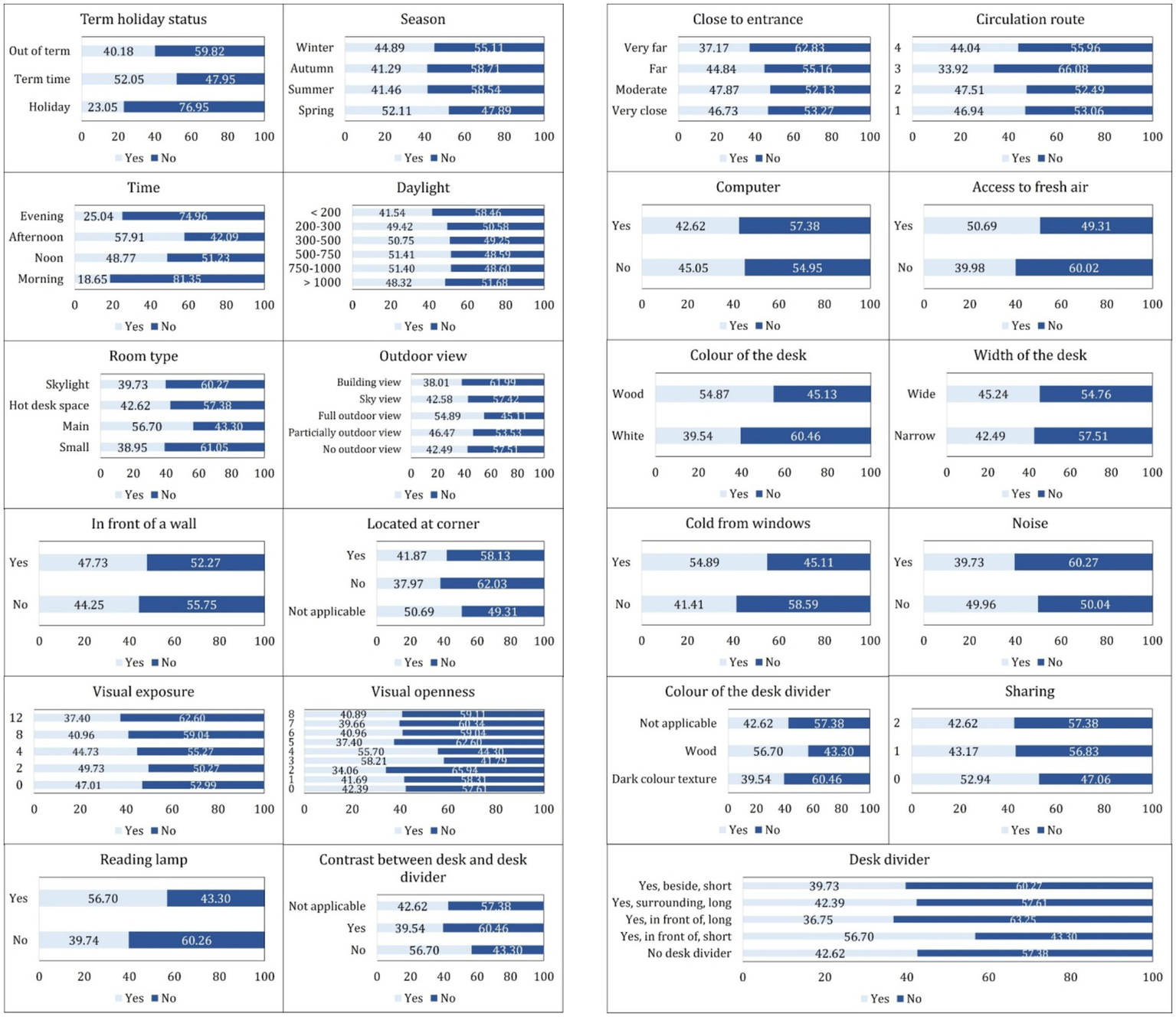 Figures 5, 6 establish the following empirical context for the inferential analysis. It depicts the distribution of the 1.3 million 10-min passive-infrared (PIR) observations across all categorical variables and shows the proportion of observations in which each seat was recorded as occupied (“Yes”) or vacant (“No”). Temporal and spatial patterns emerge clearly in the data. The majority of observations were logged during term time (53%), followed by out-of-term periods (38%) and holiday periods (9%). Seat use was relatively balanced across Spring, Summer, Autumn, and Winter, although Spring exhibited the highest instantaneous occupancy (52%). The library was busiest in the Morning and at Noon; these two periods together yielded more than 70% of all “Yes” records, whereas the Evening period contributed only about 11%. Simulated daylight levels were predominantly low, with illuminance values under 500 lux comprising nearly two-thirds of the dataset. Around 70% of seats lacked an outdoor view, and 80% were not positioned directly in front of a wall. Approximately 25% were located at a corner, and visual openness and exposure metrics were centered on the mid-range, reflecting a balanced spatial composition. Only 30% of records indicated the presence of a reading lamp, and 35% showed a contrast between desk and divider finish.