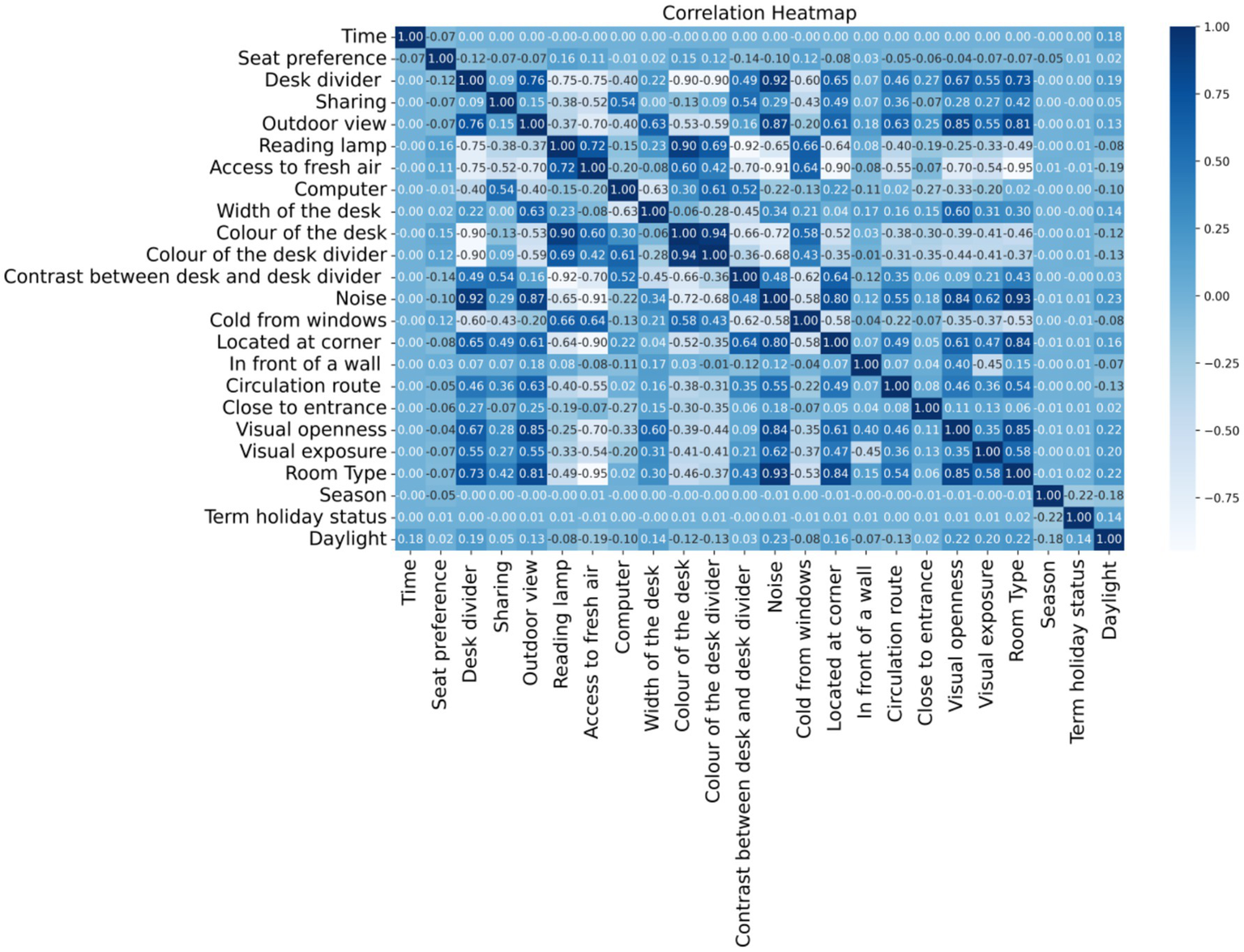 The complete list of features used in the analysis is presented in Table 1, along with corresponding definitions and value types. The Visual Openness Score was rated on a scale from 0 to 8, where lower values indicate greater enclosure (e.g., corner desks or those surrounded by dividers), and higher values represent more open, exposed locations (e.g., centrally located desks or skylit zones). Scores were derived through a combination of on-site assessments and spatial simulation metrics. The Visual Exposure Index quantifies the number of other users who can potentially view a desk’s screen based on line-of-sight proximity. Scores range from 0 (fully private) to 12 (maximum visibility) and were calculated through systematic visibility assessments across the library floor plan. Additionally, several variables include a “Not applicable” category to represent cases where the feature does not logically apply to a specific desk, such as Desk Divider Color without a divider or Corner Position for centrally located desks. These values were retained to preserve the integrity of categorical representations during model development.