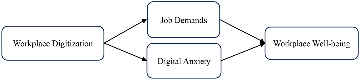 Based on this framework, we argue that workplace digitalization affects workplace well-being through two key pathways aligned with the JD-R model’s dual-process mechanism. Following the job demands pathway, digitalization can reduce traditional job demands by automating repetitive tasks and streamlining work processes, thereby decreasing work-related strain and enabling employees to engage in more creative and meaningful work (Jia et al., 2024). Simultaneously, following the job resources pathway, digitalization functions as a workplace resource that can either strengthen employee competencies and reduce digital anxiety when well-implemented, or conversely, create digital anxiety when poorly aligned with employee needs and capabilities (Palumbo, 2022). Accordingly, this study examines two critical mediating mechanisms: job demands and digital anxiety, which correspond to the dual pathways of the JD-R model. By examining these two mediating pathways—job demands and digital anxiety—this study offers valuable insights into the ways in which digitalization influences workplace well-being through the complementary processes of demand reduction and resource optimization, offering both theoretical insights and practical guidance for successful digital transformation implementation.