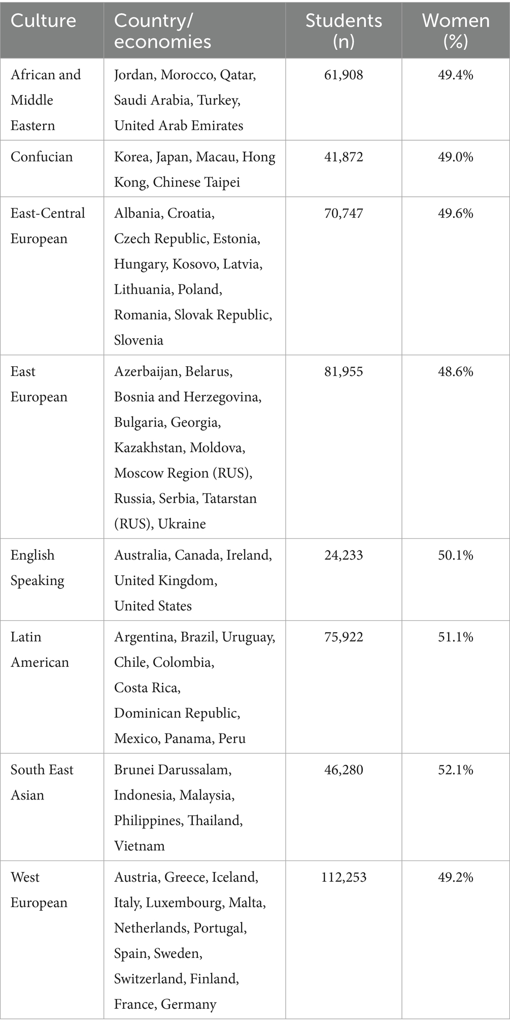The present study constitutes a secondary analysis of the PISA 2022 (OECD, 2023). This program aims to globally evaluate the competencies of 15-year-old students to prepare them for future challenges. In 2022, the PISA team focused on the reading literacy of students. Hence, this study focuses on reading-related variables. Data encompassing 515,170 students from 70 countries were utilized, with countries and economies being segmented into eight cultural groupings (Schwartz, 2009; Wang et al., 2021). Table 1 reports the sample countries in each culture group, sample size, and percentage of women. Across the eight cultures, the sample size ranged from 24,233 to 112,253, and the proportion of female participants fluctuated from 48.6 to 52.1%.