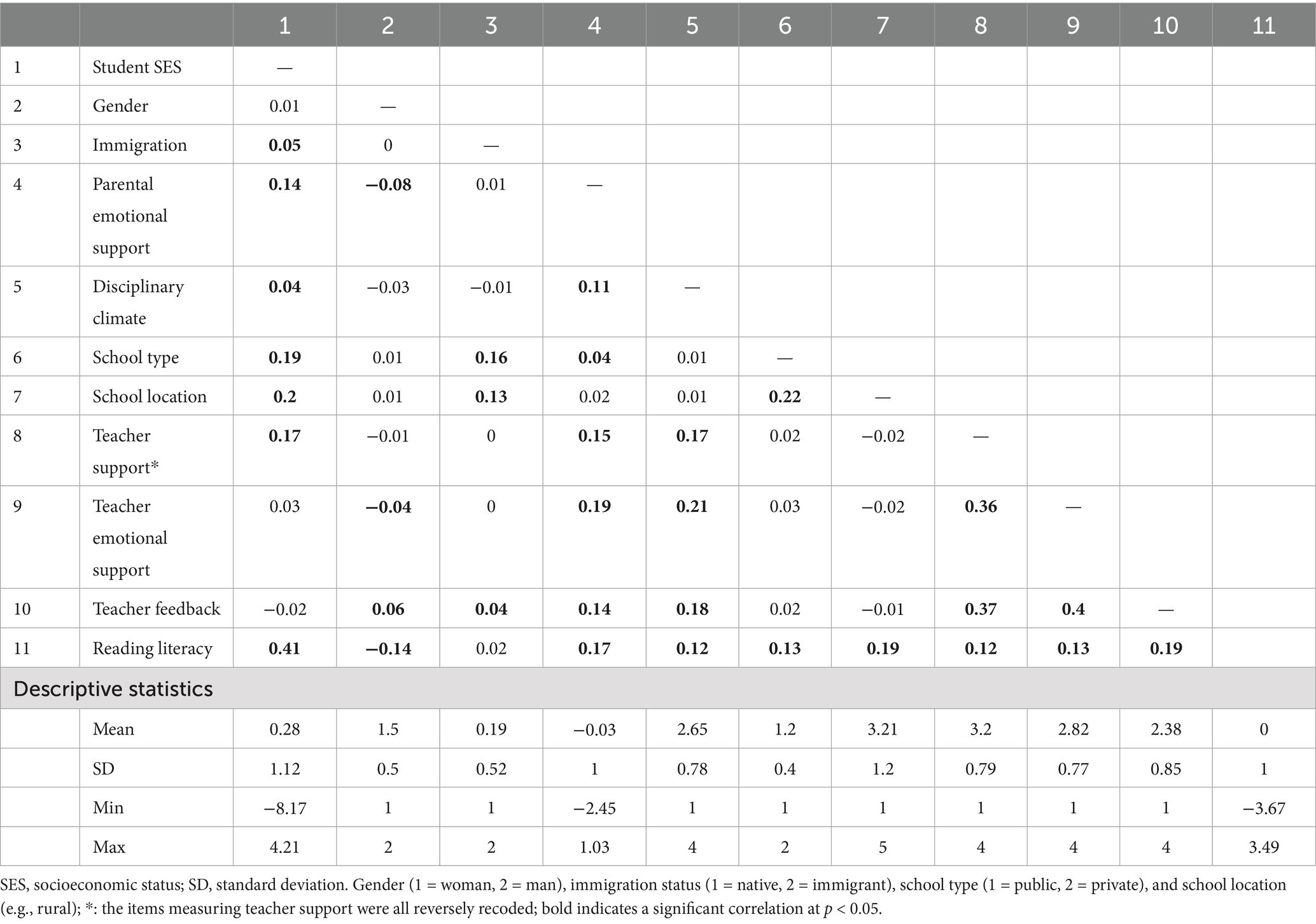 Individual- and school-level covariates were included to control for confounding factors. Individual-level variables included gender (coded as 0 = woman vs. 1 = man), immigration status (coded as 0 = native, 1 = second generation, and 2 = first generation), parental emotional support, and disciplinary climate, all of which are related to reading literacy (Chen et al., 2022; Rvachew et al., 2020). Parental emotional support reflecting parents’ involvement in their child’s well-being and a emotionally supportive family environment. It was assessed using three items from the PISA Parental Emotional Support scale (e.g., “My parents encourage me to be confident”), with good internal consistency with Cronbach’s α ranging from 0.72 to 0.85 across cultures. Disciplinary climate is defined as a measure of the extent to which students experience disruptions in their learning environment. It was measured using five items (e.g., “How often: Students cannot work well”), with higher scores reflecting more orderly classrooms; reliability ranged from 0.72 to 0.83 across cultural group.