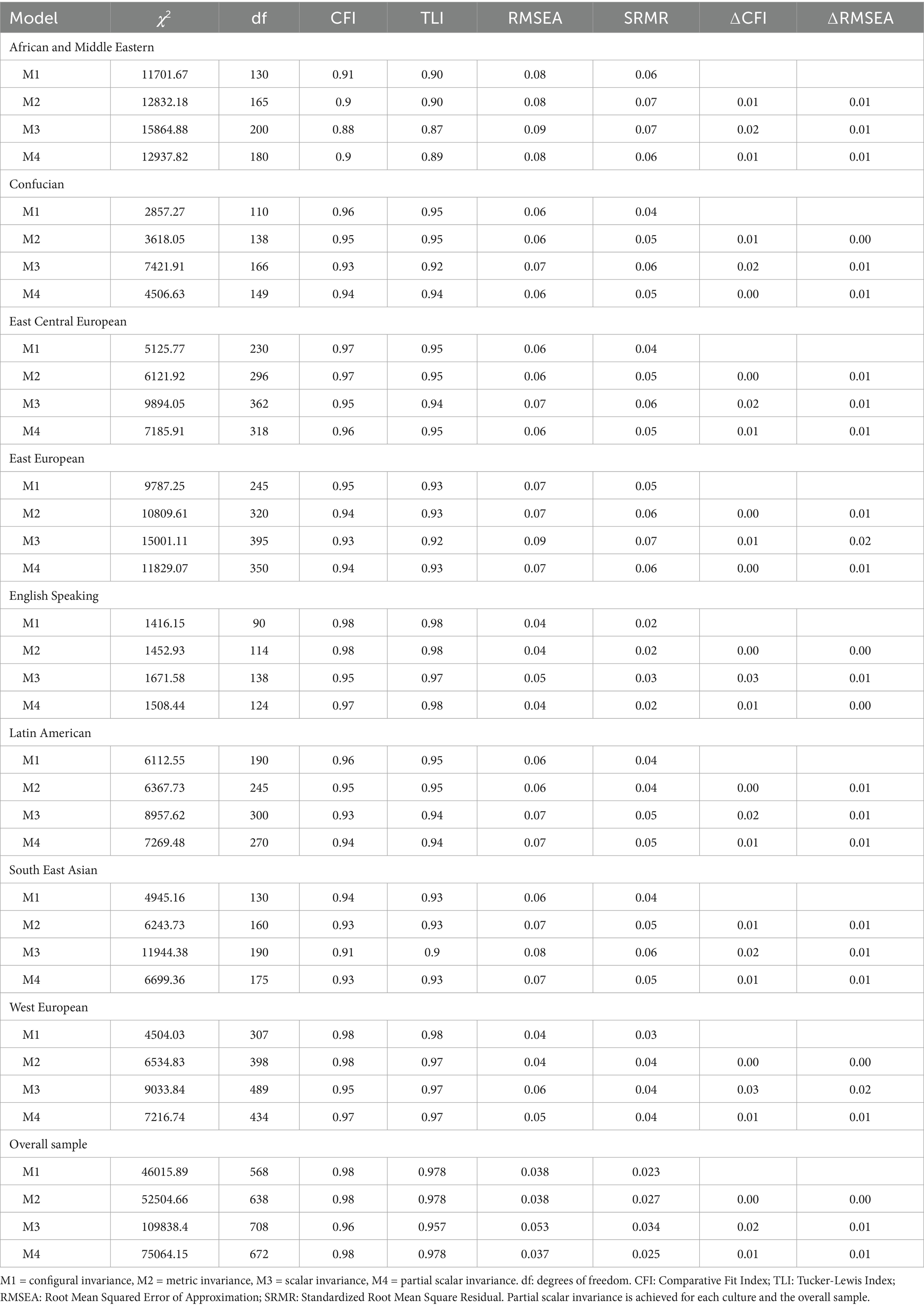 The SEM results are presented and summarized in Tables 4, 5, respectively. The top half of Table 4 shows that SEM had an acceptable fit across the eight cultural groups. However, the English-speaking culture was an exception, with a CFI of 0.90 and a TLI of 0.89. However, these indices still fall within the marginally acceptable range (e.g., CFI ≥ 0.90; RMSEA ≤ 0.08) as suggested by previous literature (Marsh et al., 2004). Given the complexity of the model, the inclusion of latent constructs, and the cross-cultural nature of the data, such marginal fit can be expected and is considered acceptable in large-scale international studies (Byrne and de Vijver, 2017). Therefore, we interpret the model as adequately fitting for the English-speaking sample.