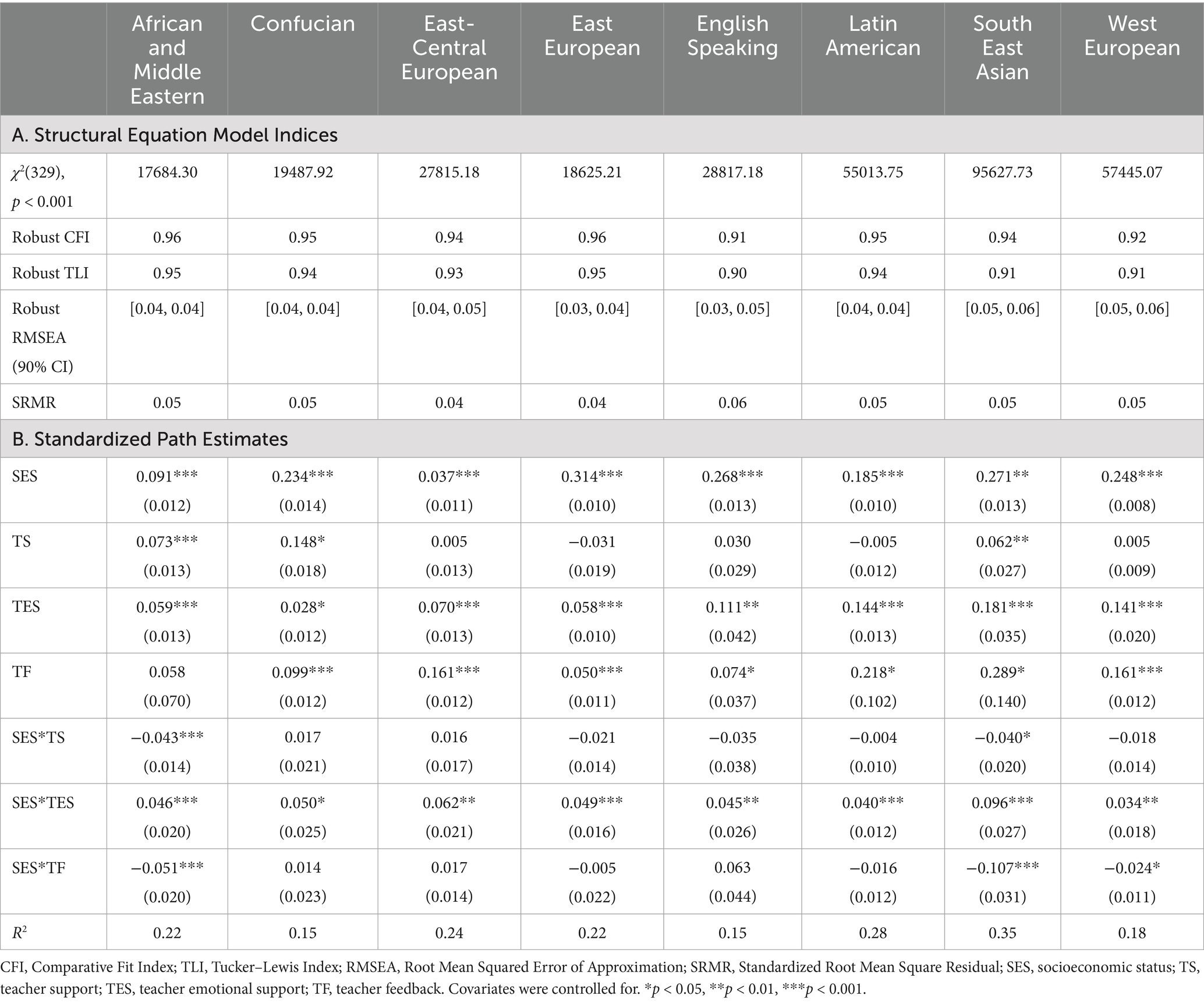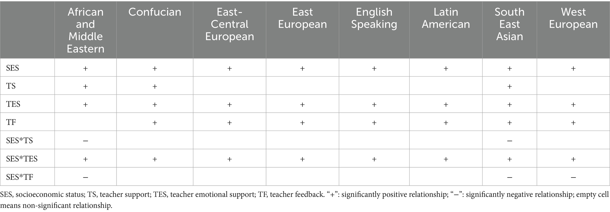 The SES-TS interaction shows negative influences in African and the Middle Eastern (β = −0.043, p < 0.001) and South East Asian (β = −0.040, p < 0.05) cultures, and no effect in other cultures. The interaction between SES and TES show positive effects on student achievement in all cultures (0.034 < βs < 0.096, p < 0.05). Lastly, for the interaction between SES and TF, a negative effect on student achievement is found in the African and the Middle Eastern (β = −0.051, p < 0.001), South East Asian (β = −0.107, p < 0.001), and West European (β = −0.024, p < 0.05) cultures. No significant effects were noted in the other cultures.