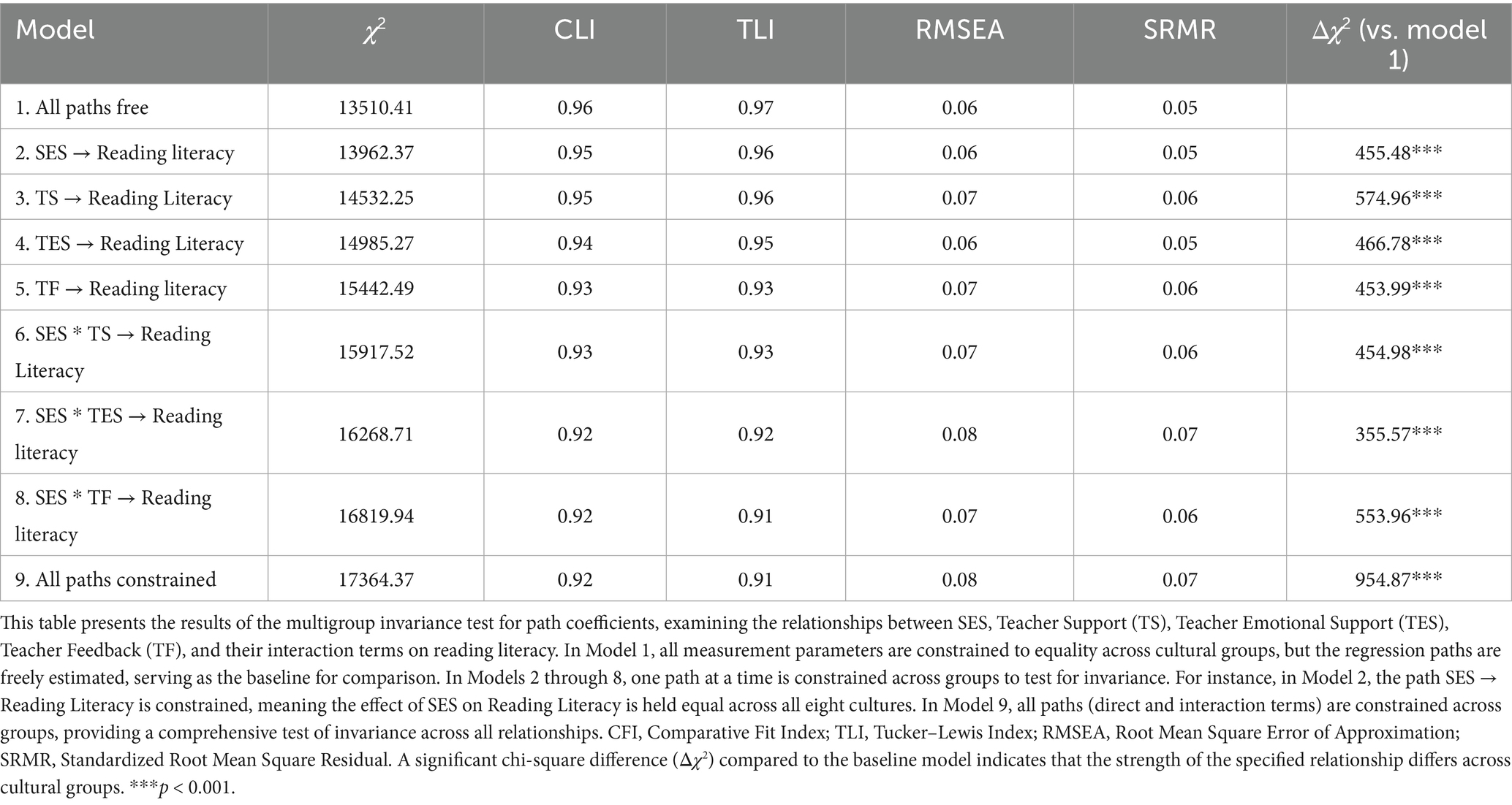 Table 6 presents the results of the multigroup invariance tests for the key paths in the model. The fit indices indicate that all models demonstrate a good fit across cultural groups, with CFI > 0.90 and RMSEA < 0.08. In the baseline model (Model 1 in Table 6), all measurement parameters are constrained to equality across cultural groups, while the regression paths are freely estimated. Next, we sequentially imposed equality constraints on each path (Models 2–8 in Table 6) and compared them with the baseline model. Significant chi-square differences (Δχ2) suggest variability in the magnitude of path coefficients across the eight cultures. For instance, in Model 2, the path from SES to reading literacy was constrained. A significant chi-square difference (Δχ2 = 455.48, p < 0.001) indicated that the effect of SES on reading literacy is not consistent across cultural contexts.