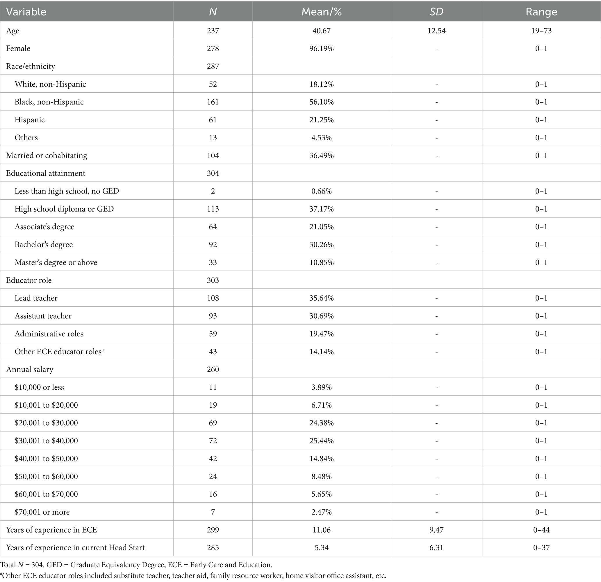 This study involved a survey of 304 educators across 54 Head Start sites located in two Mid-Atlantic states in the United States. These educators were recruited as part of a professional development (PD) training, specifically designed for enhancing the holistic well-being of Head Start educators. We only used pre-test data in the current study. Table 1 presents the demographic characteristics of the participants. Among those educators who completed the pre-test survey, 35.6% were lead teachers, 30.7% were assistant teachers, and 19.5% were in various administrative roles (e.g., program directors, family service coordinators, education coordinators), and 14.1% were in other ECE educator roles (e.g., substitute teacher, teacher aid, and home visitors). Around 96.2% of survey respondents were female. The ethnic composition of the participants was primarily Black/African American, non-Hispanic (56.1%), followed by Hispanic (21.3%), and White, non-Hispanic (18.1%). The average age of participants was approximately 40.7 years, with an average of 11.1 years of experience in ECE. Regarding the educational attainment among the participants, 62.2% of them held an associate degree or higher, and 41.1% had a bachelor’s degree or above. In terms of salary, the majority (64.5%) reported annual earnings ranging from $20,000 to $50,000.