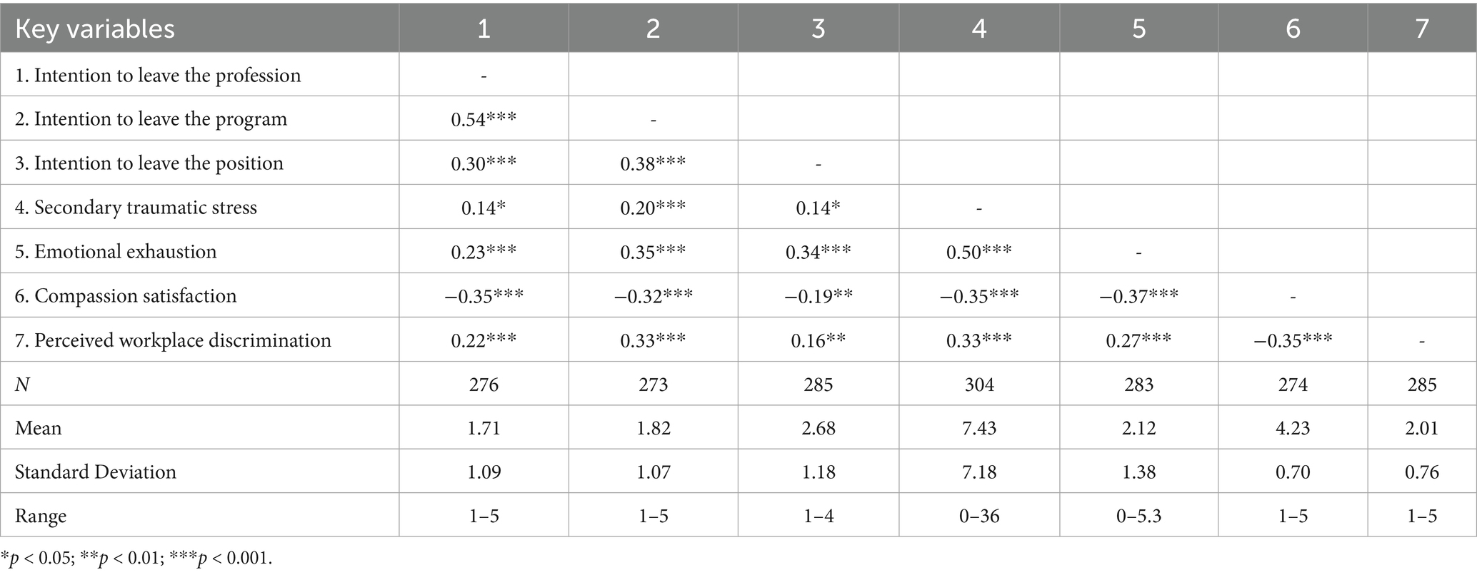 Regarding the missing data in the outcome variables, there were 9.21% of missing data in educators’ intention to leave their profession, 10.20% of missing in intention to leave their current program, and 6.25% of missing in intention to leave their current position. In terms of the independent variables, there was no missing in STS, 6.91% of missing in emotional exhaustion, and 9.87% of missing in compassion satisfaction, 6.25% of missing in workplace discrimination. Among the covariates, 5.59% of missing in race/ethnicity, 1.64% of missing in years of working experiences, 0.33% missing in educator’s title, 6.91% missing in salary, and no missing in education attainment. We did not find statistically significant differences between participants with complete data and those with incomplete data regarding their professional well-being, perceived workplace discrimination, and turnover intentions. To address the issue of missing data, we employed the method of multivariate imputation by chained equations and generated 10 imputed datasets to capture the statistical uncertainty in cross-sectional data (Austin et al., 2021; Molenberghs and Kenward, 2017). In addition, we compared the results of the primary models from the imputed data to those from the complete-case analysis. The significance and patterns of the results remained consistent between both data sets, and we did not find any substantial differences in variance components, which suggested that the imputation did not substantially bias the variance estimates.