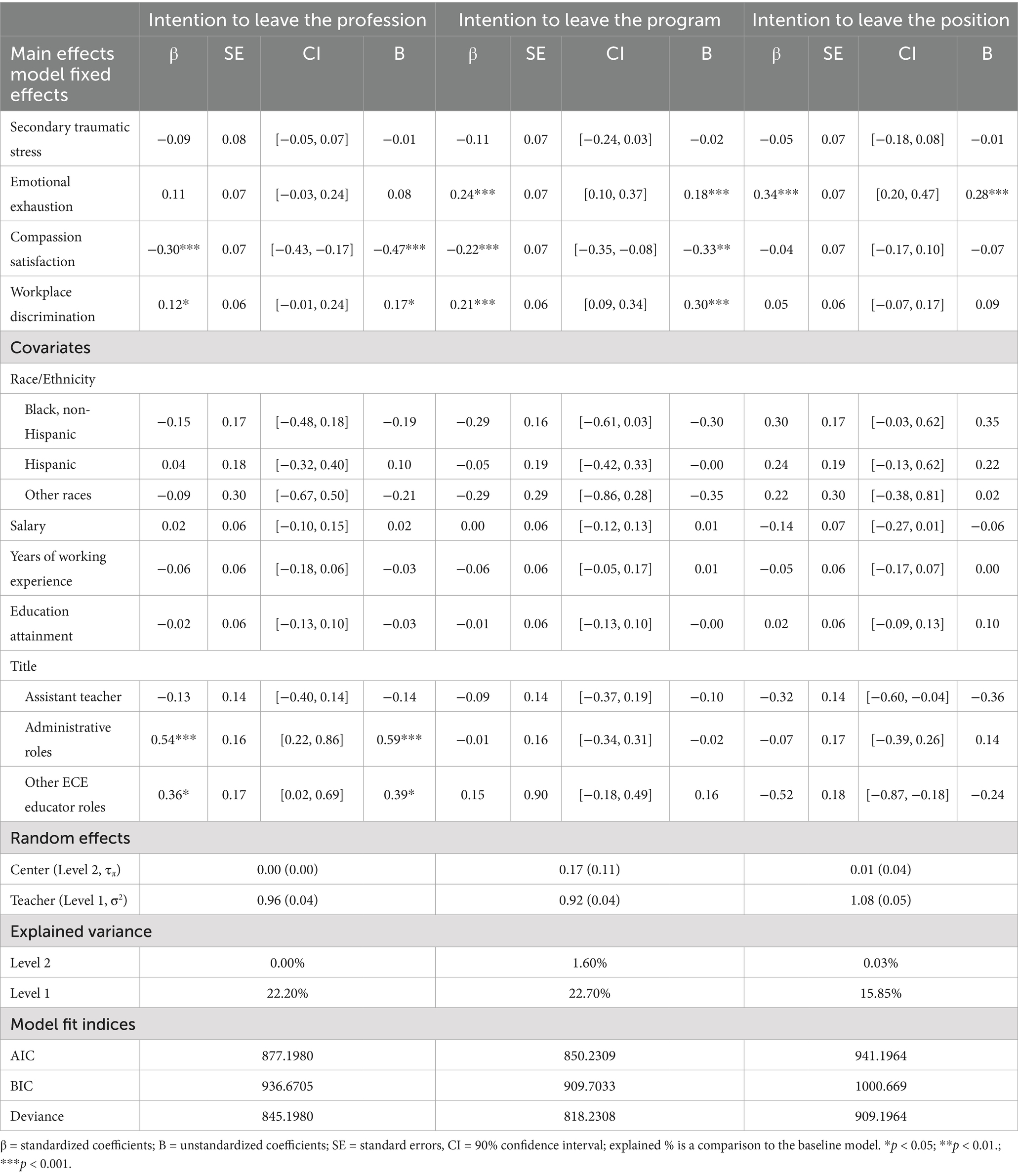 In the multi-level analyses, we first included only control variables in the models to estimate the model fit and the explained variances of the baseline models. The model fit indices that were used include Deviance (Hardin and Hilbe, 2018), Akaike’s information criterion (AIC; Akaike, 1987), and Bayesian information criterion (BIC; Schwarz, 1978). Second, in the main effects models, we added STS, emotional exhaustion, compassion satisfaction, and workplace discrimination variables. We compared the main effects models with the baseline models that did not include control variables to calculate the total variances explained in each outcome variable. Then, we compared the main effects models with the baseline models only with control variables, to calculate the unique variance explained by STS, emotional exhaustion, and compassion satisfaction after accounting for the control variables. Next, we added the interaction terms between key independent variables (i.e., STS, emotional exhaustion, and compassion satisfaction) and perceived workplace discrimination to the main effects models. Additionally, during the model building process, we compared the models with and without random slopes across centers between the independent and dependent variables. In particular, we examined three distinct models for three types of turnover intentions (i.e., intention to leave the profession, program, and position). For each model, we tested all possible combinations of random slopes for the four key predictors. This resulted in 45 model comparisons with the random intercept only models. We also checked the convergence of these models during comparisons. It is noted that models allowing both random slopes and intercepts did not demonstrate better model fit compared to models with only random intercepts. We found that the Deviance, AIC, and BIC values of these random slopes models remained largely similar to the random intercept only models. Given that there was no meaningful improvement in model fit with random slopes, we decided to keep the more parsimonious random intercept-only models. Therefore, we chose models that allowed intercepts to vary and fixed the slopes in each model. The final main effect models are: