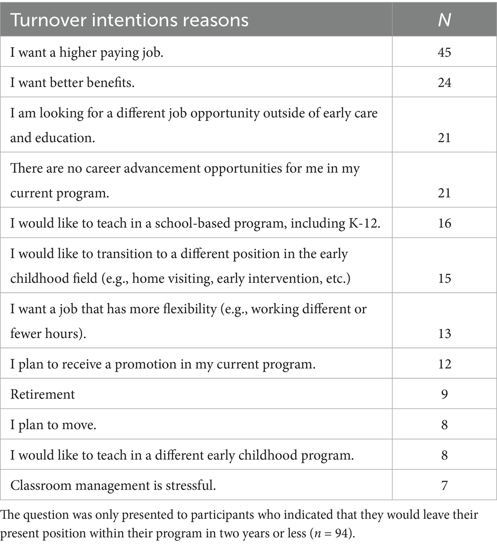 Finally, to examine the underlying reasons behind Head Start Educators’ turnover intentions, we counted the frequency of turnover intention reasons educators selected among the 13 options. Additionally, we coded participants’ answers to the “Other” option in the question and included the frequency of common answers (n > 2) regarding their potential turnover intention reasons.