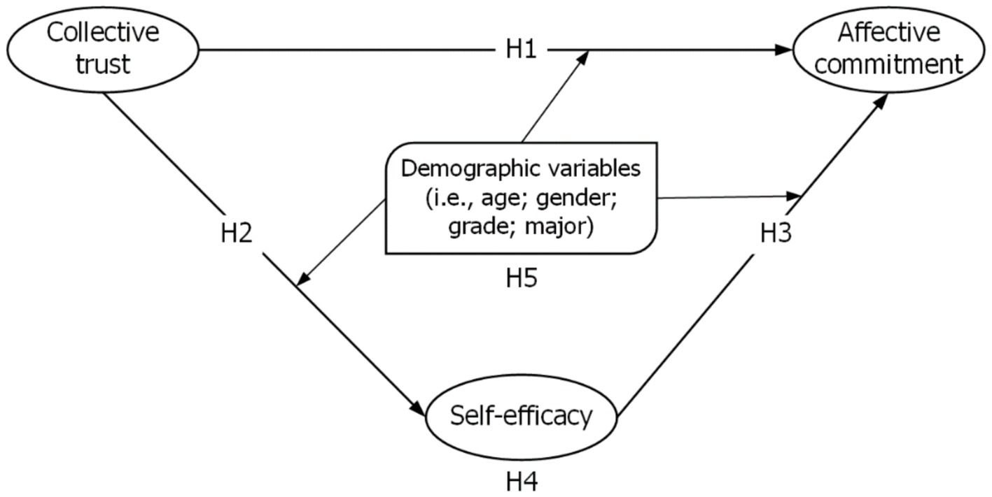 H5: Demographic variables (age, gender, grade level, and major) moderate the relationship between collective trust, self-efficacy, and affective commitment.