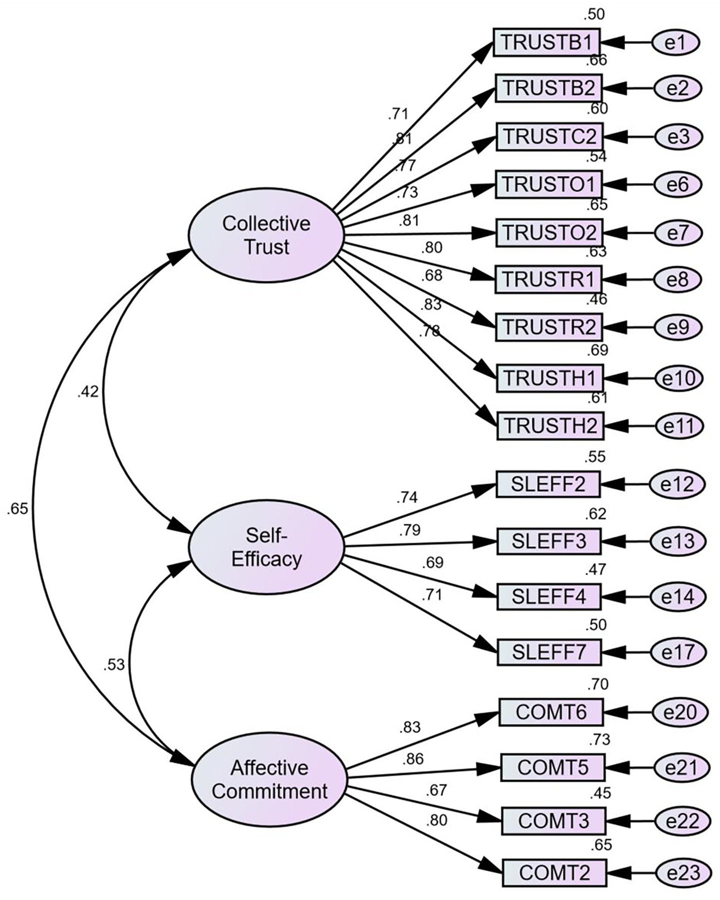 All questionnaire responses were screened and cleaned prior to hypothesis testing. Missing values were identified and addressed, and two negatively worded items were reverse scored: “Supervisors at this school do not care about students [B3]” and, “I think I could easily become as attached to another school as I am to this one [comt8].” Demographic variables were tabulated, and univariate normality was assessed with skewness and kurtosis. The full sample of 968 cases met the normality criteria and was used in subsequent analyses. We followed the two-step approach to covariance-based structural equation modeling in AMOS 24 (Anderson and Gerbing, 1988). In the measurement phase, we used confirmatory factor analysis to evaluate indicator loadings, internal consistency (via composite reliability and Cronbach’s alpha), convergent validity (via average variance extracted), discriminant validity (via heterotrait–monotrait ratio of correlations [HTMT]), and overall measurement model fit. We judged model fit by normed chi square (χ2/df), Tucker Lewis Index (TLI), Comparative Fit Index (CFI), Root Mean Square Error of Approximation (RMSEA), and Standardized Root Mean Square Residual (SRMR) against conventional benchmarks (χ2/df < 3, TLI and CFI > 0.95, RMSEA < 0.06, SRMR ≤ 0.08) (Schreiber, 2008). Composite mean scores for the three latent constructs were computed from the items retained in the measurement model. Descriptive statistics (e.g., mean, standard deviation) and Pearson partial correlations controlling for age, gender, academic major, and educational attainment were calculated in SPSS version 25 to examine bivariate associations and to indicate the degree to which participants reported collective trust, self-efficacy, and affective commitment. In the structural phase, we tested the hypothesized direct effects. Indirect effects were examined with bootstrap mediation using 2,000 resamples, and moderation by demographic covariates was tested with Hayes’s PROCESS macro for SPSS version 4.2 (Hayes, 2013).
