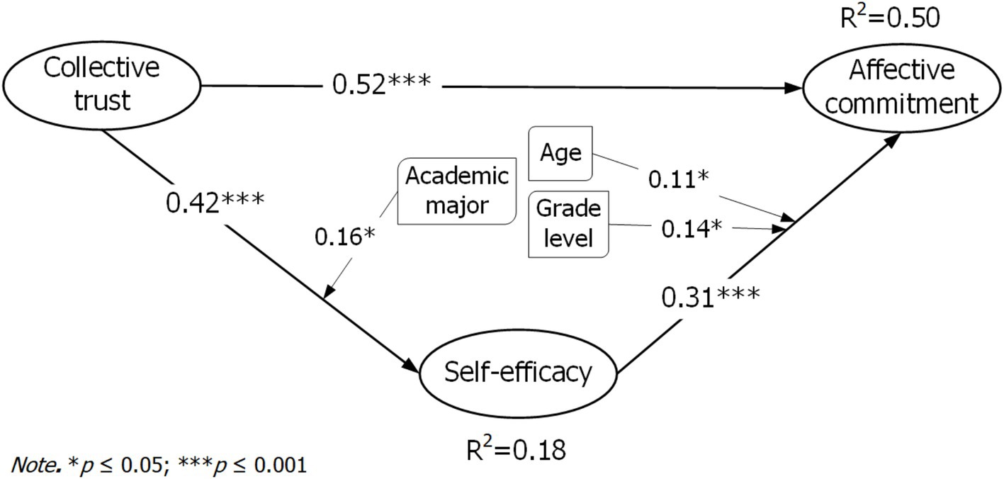 Objective: This study tested whether collective trust in supervisors predicts university students’ affective commitment and whether student self-efficacy mediates this relationship. Demographic variables (age, sex, grade level, and major) were evaluated as potential moderators.