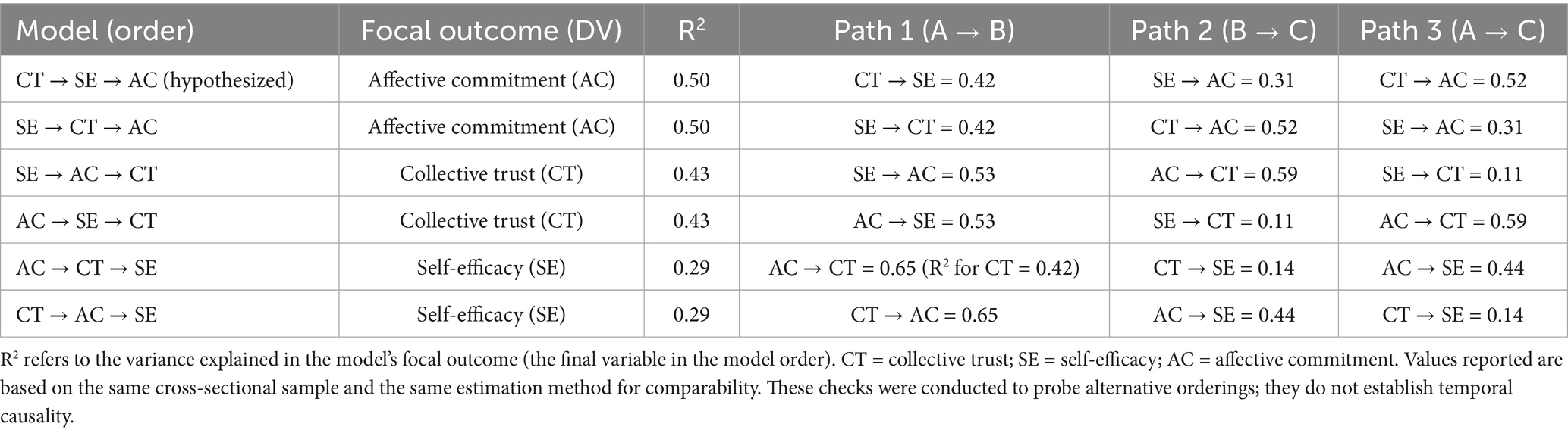 To probe alternative temporal orderings given the cross-sectional design, we estimated several plausible model permutations (see Table 1) and compared the explained variance and path coefficients across specifications. We estimated six permutations (e.g., CT → AC → SE, SE → CT → AC, and AC → SE → CT) and compared the variance explained in the focal outcome for each specification. The hypothesized model (CT → SE → AC) accounted for 50% of the variance in affective commitment (R2 = 0.50) and yielded standardized paths of CT → AC = 0.52, CT → SE = 0.42, and SE → AC = 0.31. A reciprocal specification with SE as an antecedent to CT (SE → CT → AC) produced the same R2 for affective commitment (R2 = 0.50) and similar coefficients, while several other permutations produced lower explanatory power (R2 = 0.29–0.43). These checks indicate that alternative orderings are empirically plausible; however, the hypothesized ordering was selected because it is theoretically motivated by Relationship Motivation and Social Identity Theories and because it delivers equivalent or superior explanatory power compared with most alternative permutations. Therefore, we present a unidirectional model while acknowledging that reciprocal dynamics may operate in practice. We recommend future cross-lagged or experimental studies to directly test bidirectional effects.