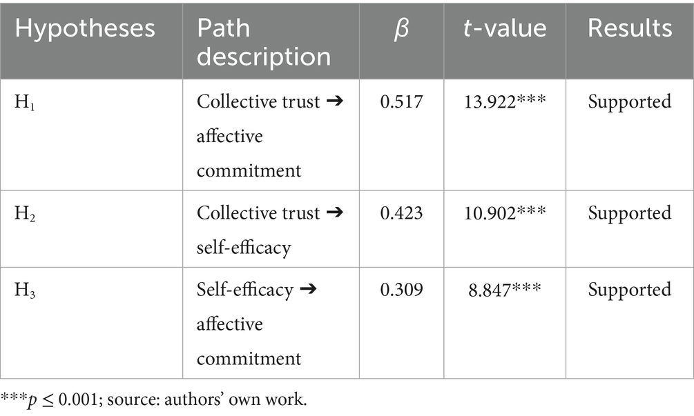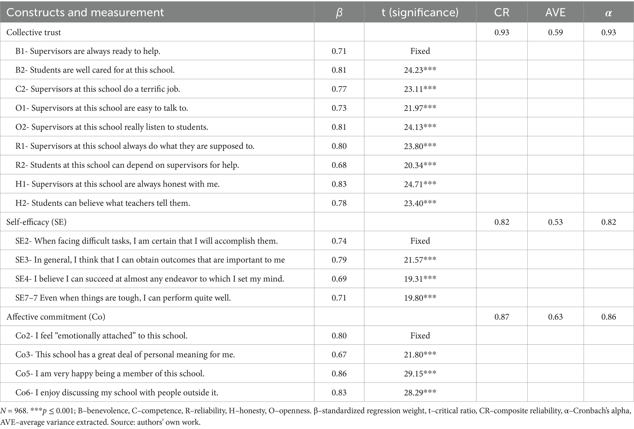 The scales’ reliability and construct validity are satisfactory. Composite reliabilities and Cronbach’s alpha coefficients ranged from 0.82 to 0.93 (Table 2), exceeding the recommended minimum of 0.70 (Ali et al., 2018; Fraenkal and Wallen, 2000). Average variance extracted (AVE) values exceeded 0.50 for all constructs (see Table 2), supporting convergent validity (Ali et al., 2018; Fornell and Larcker, 1981). Discriminant validity assessed with the heterotrait–monotrait ratio of correlations produced values between 0.420 and 0.660 well below the 0.85 threshold recommended by Henseler et al. (2015). Partial correlations controlling for age, gender, program of study, major, and year of enrolment indicate that collective trust was moderately associated with affective commitment (r = 0.590, p < 0.001), collective trust was positively associated with self-efficacy (r = 0.393, p < 0.001), and self-efficacy was positively associated with affective commitment (r = 0.452, p < 0.001). These patterns of partial correlations, which control for key demographic covariates, align with theoretical expectations and provide additional evidence of convergent validity before testing the structural model.